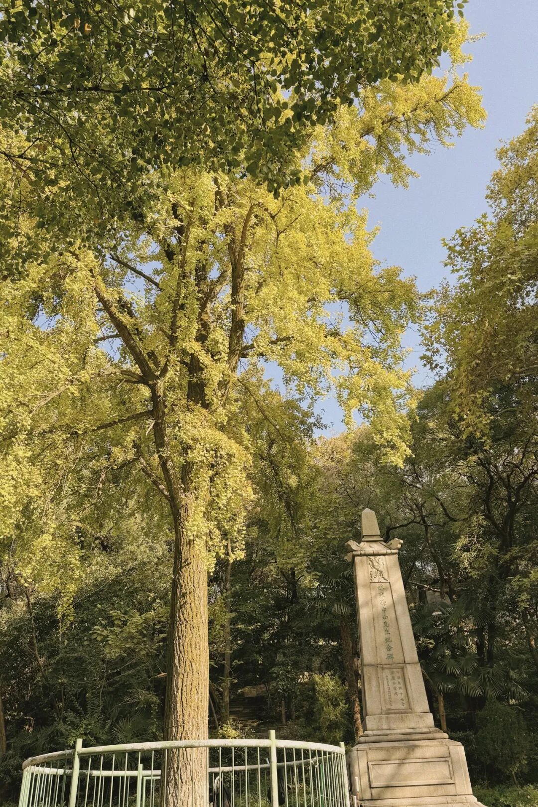 徒步到蛇山南麓,可以看到一棵武昌起义时栽种的银杏树扎根于此,一百多年默默地守护在孙中山纪念碑旁。