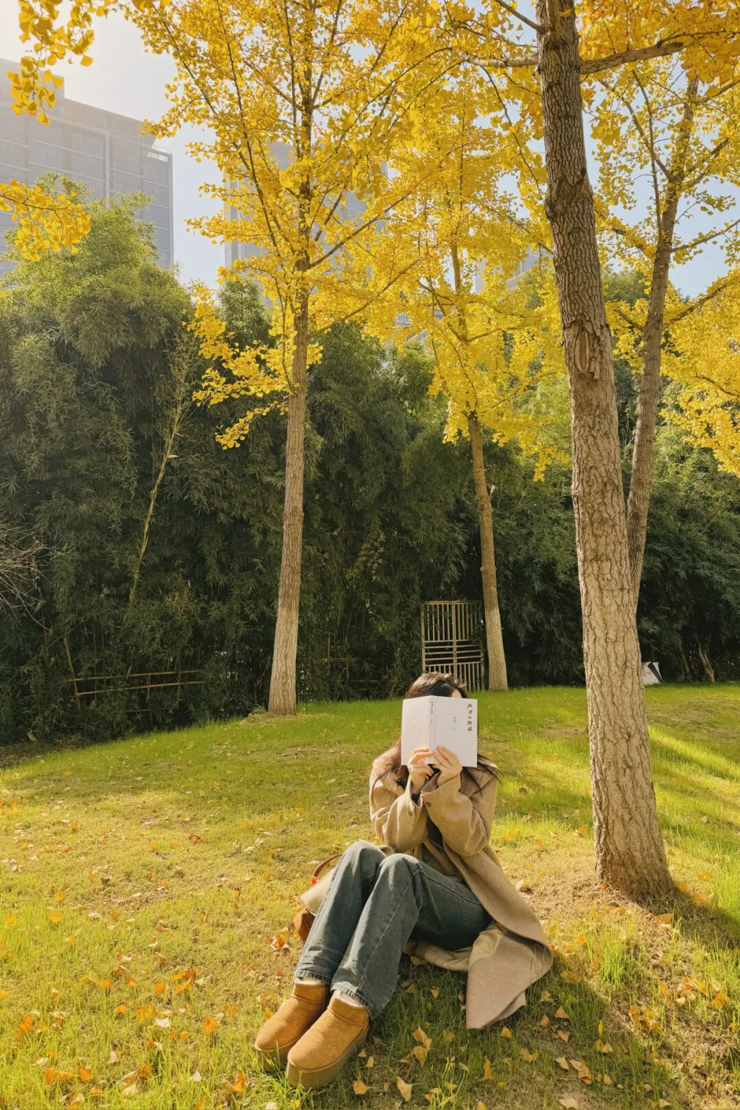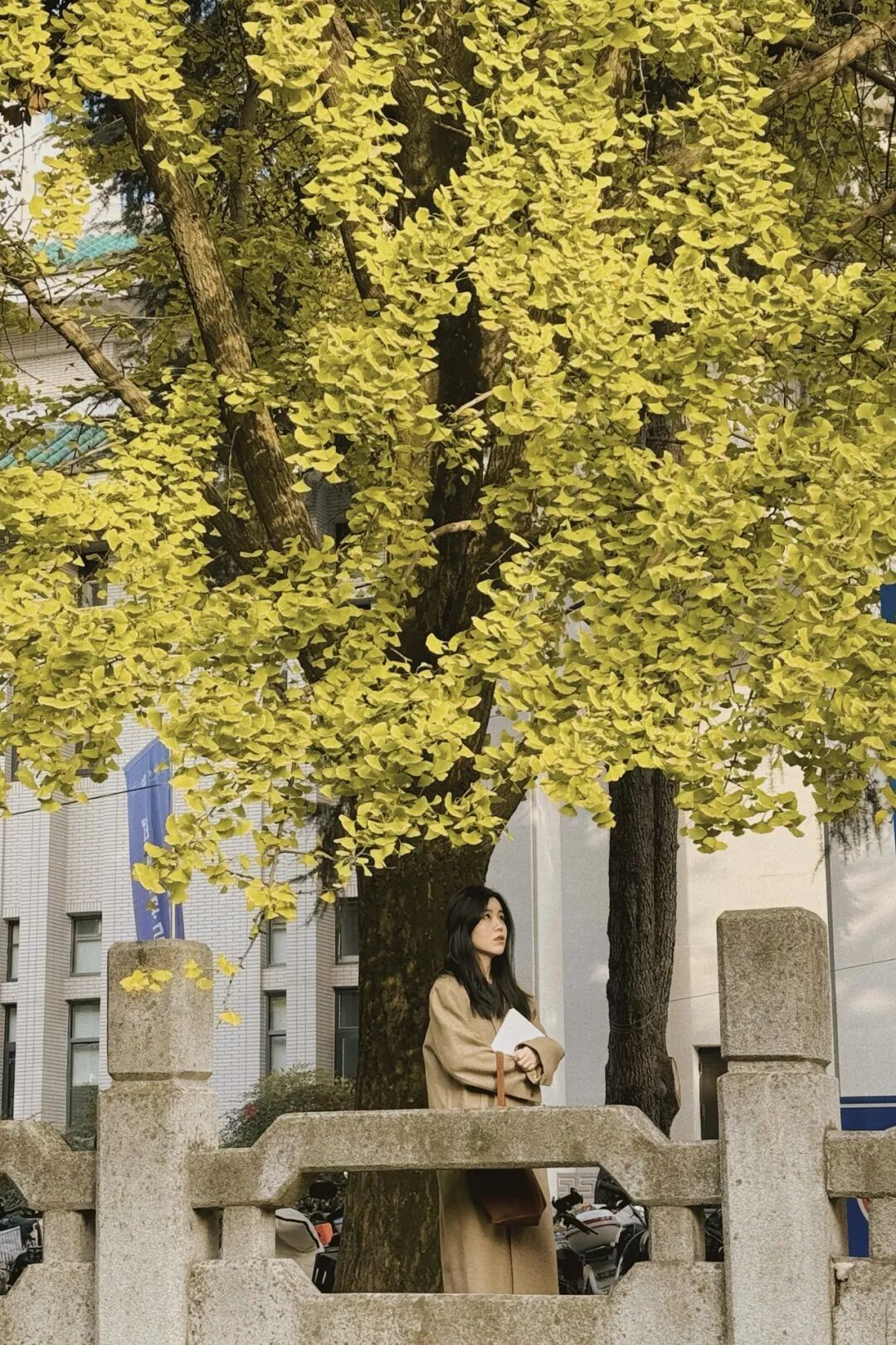 青春洋溢的大学生恰好坐在银杏树前温习功课,一组秋冬的“氛围感”大片就此诞生。
