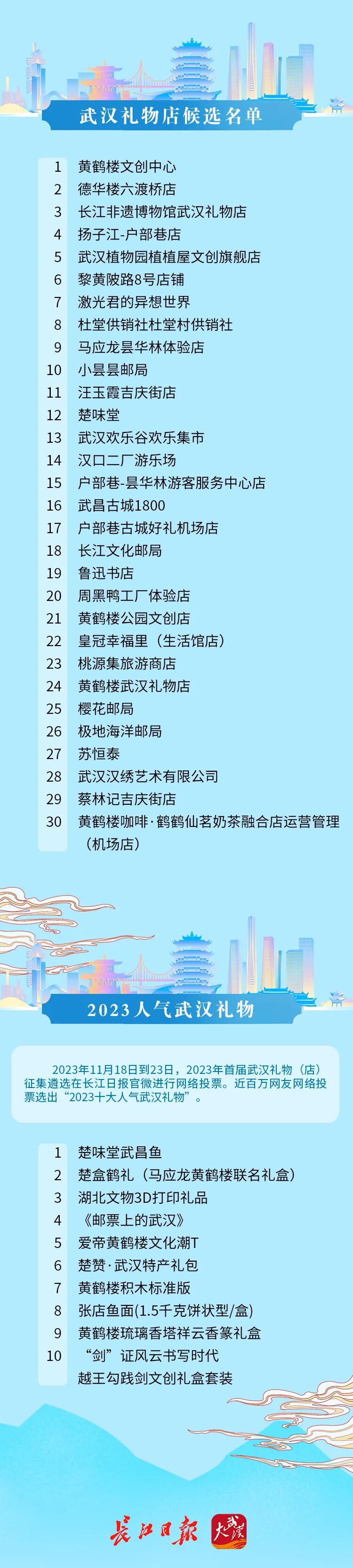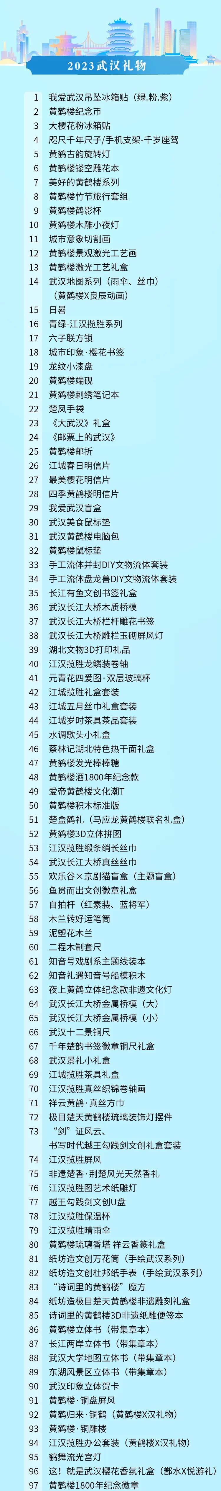 2023年,武汉市开展首届武汉礼物(店)征集遴选活动。活动于11月3日正式启动,其间共征集到542件武汉特色旅游商品、81家武汉旅游行业门店报名参加。