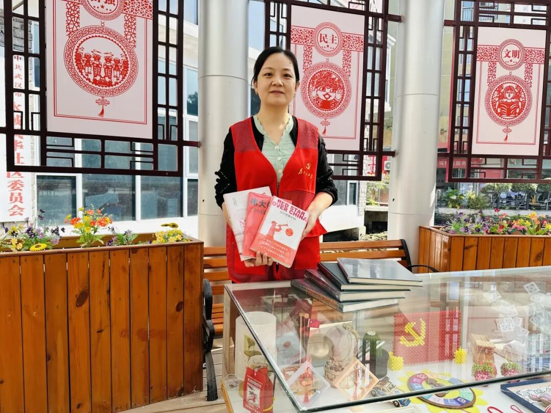 ▲ 社区下沉党员捐赠红色书籍和红色手工艺品
