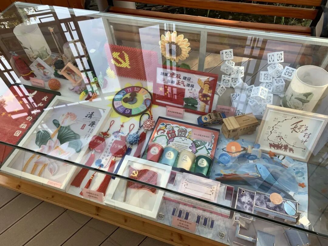 目前亭内由11块丰富多彩的绘板围绕,下面的木质花坛里摆放着社区居民和小朋友手工制作的布艺花束花盆。以水域风华社区logo形状设计的共享书屋小书柜静立在亭子一角,透明的展示柜内摆放着各式各样的红色手工作品,有香囊、廉政衍纸画等,都是党员居民志愿者的成果。共同努力让“益心共创亭”成为一个真正属于大家的公共空间,供大家开心学习、快乐活动、幸福成长。