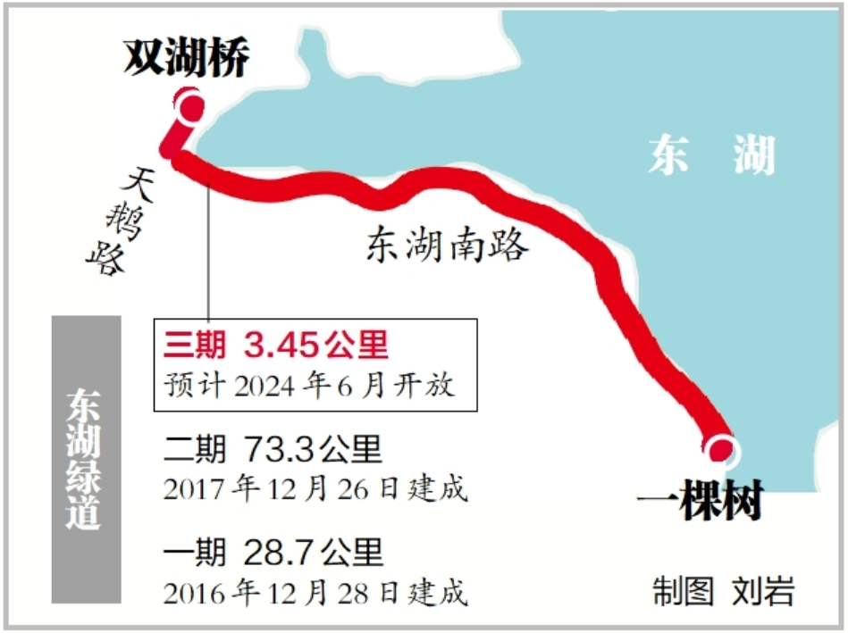 建设单位武汉城市发展集团相关负责人介绍,东湖绿道三期起于双湖桥,止于风光村一棵树转盘,全长3.45公里,以“书香道”为主题,将实现机动车道、骑行道、步行道三道分流,更好地让市民游客感受湖光山色、品味文化底蕴,预计2024年6月对公众开放。