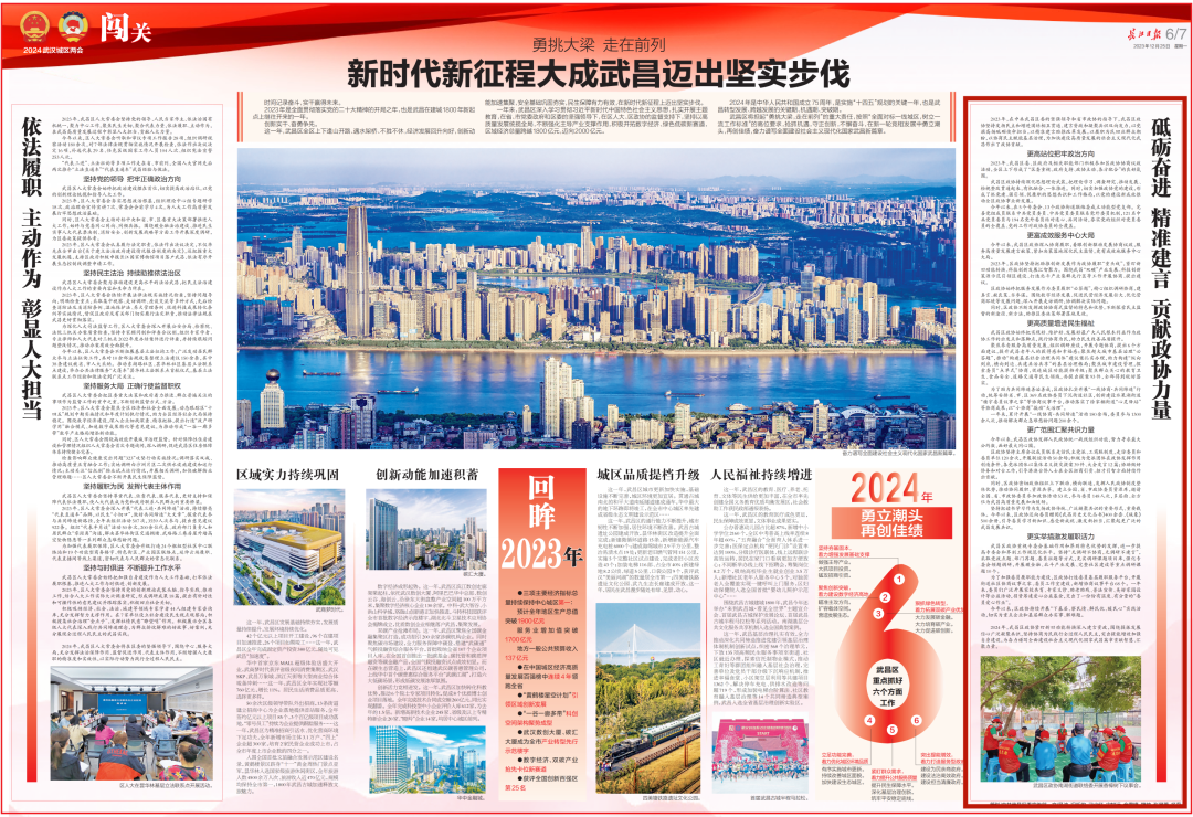 2024年,武昌区政协紧盯新旧动能转换深入建言资政,围绕提振发展信心广泛凝聚共识,坚持协商为民践行全过程人民民主,突出提能增效加强自身建设,为奋力谱写全面建设社会主义现代化国家武昌篇章贡献智慧、汇聚力量。