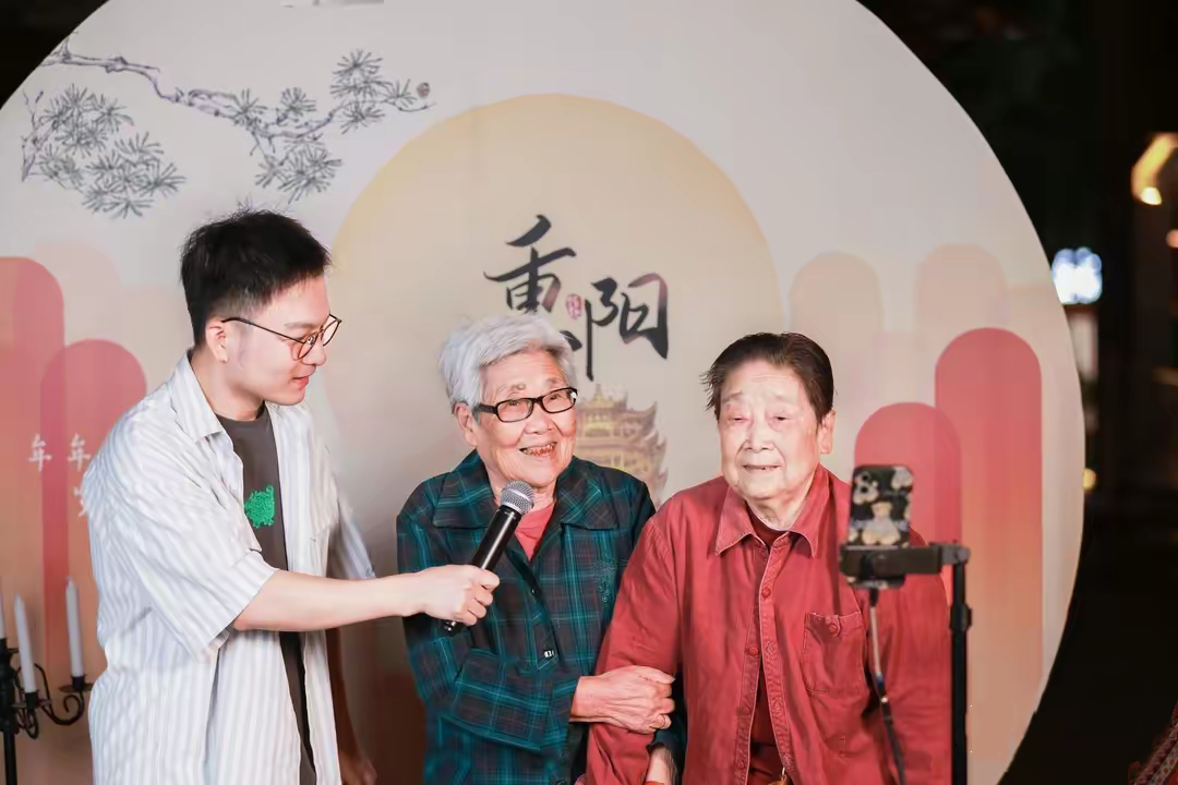 ▲“可视电台”重阳节专场,耄耋老人手挽着手分享美好生活。图源:长江演播中心