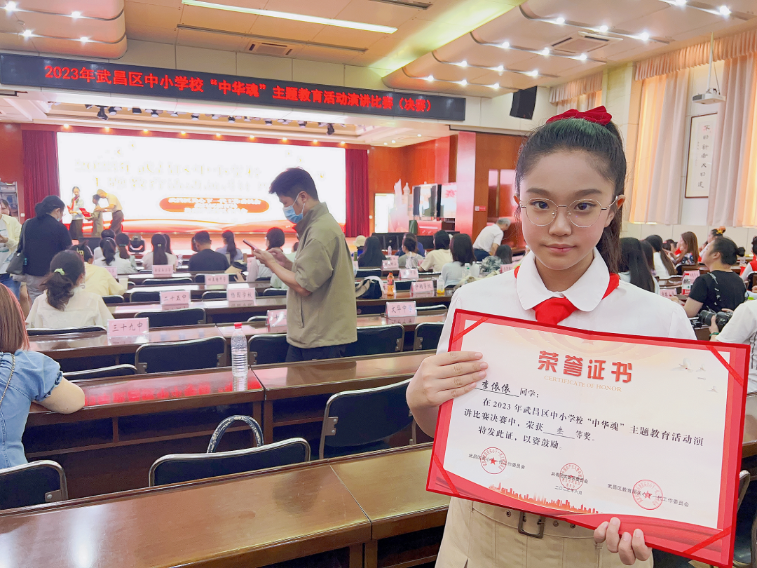 她品学兼优、全面发展,被评为2023年武汉市优秀学生、2021年武昌区“优秀学生”称号,获得武汉市“红领巾奖章”三星章,4次获得“红领巾奖章”二星章。她学以致用,热心公益,2023年在“美好生活共同缔造 我的城市我做主”武汉市儿童友好城市主题活动中,斩获书信比赛二等奖。