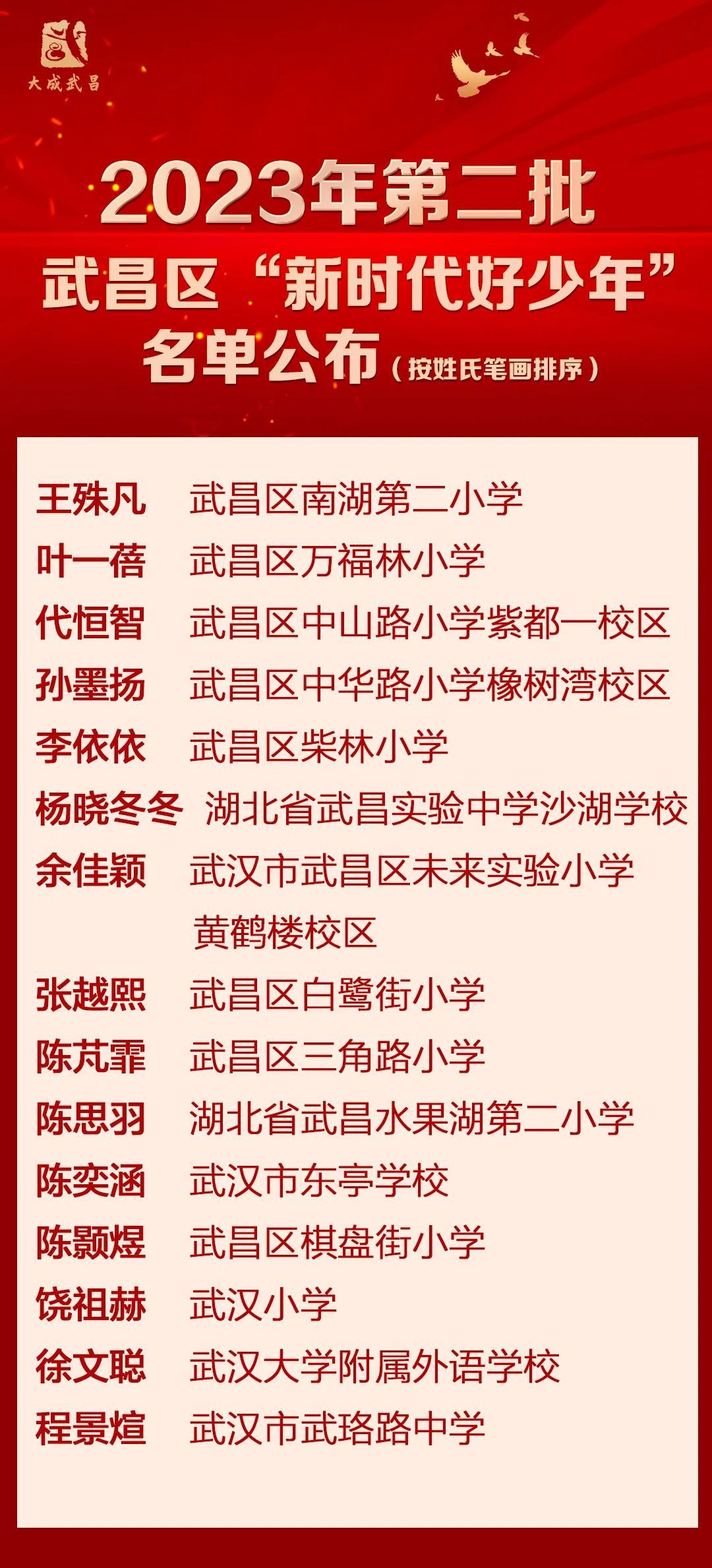 为响应中央和省市文明办要求,培养德智体美劳全面发展的社会主义建设者和接班人,区委文明办、区教育局、团区委、区妇联、区关工委五部门联合发布2023年第二批武昌区“新时代好少年”,武昌区南湖第二小学王殊凡等15名同学获此荣誉。