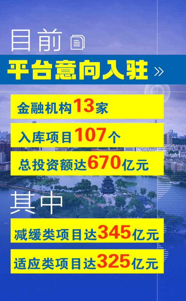 目前,平台意向入驻金融机构13家,入库项目107个,总投资额达670亿元,其中减缓类项目达345亿元,适应类项目达325亿元。