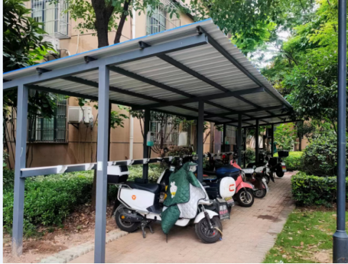 物业公司给出小区整体规划图;社区网格员、楼栋党小组长、党员志愿者、居民志愿者实地走访考察,广泛征集意见,征得居民同意后,在小区8栋公共绿化花坛旁建设带充电设施的停车棚,现停车棚已投入使用。
