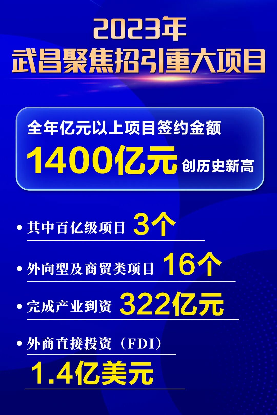 2023年武昌聚焦招引重大项目,长江产业投资基金公司、长江创业投资基金公司等百亿级总部纷至沓来,中粮贸易、中国供销粮油、国联人寿、中建三局城市生命线、湖北矿产资源等央企国企总部项目鳞次栉比。全年亿元以上项目签约金额1400亿元,创历史新高,其中百亿级项目3个、外向型及商贸类项目16个,完成产业到资322亿元、外商直接投资(FDI)1.4亿美元,招商引资各项指标稳居中心城区前列,经济总量、发展增速保持领先!