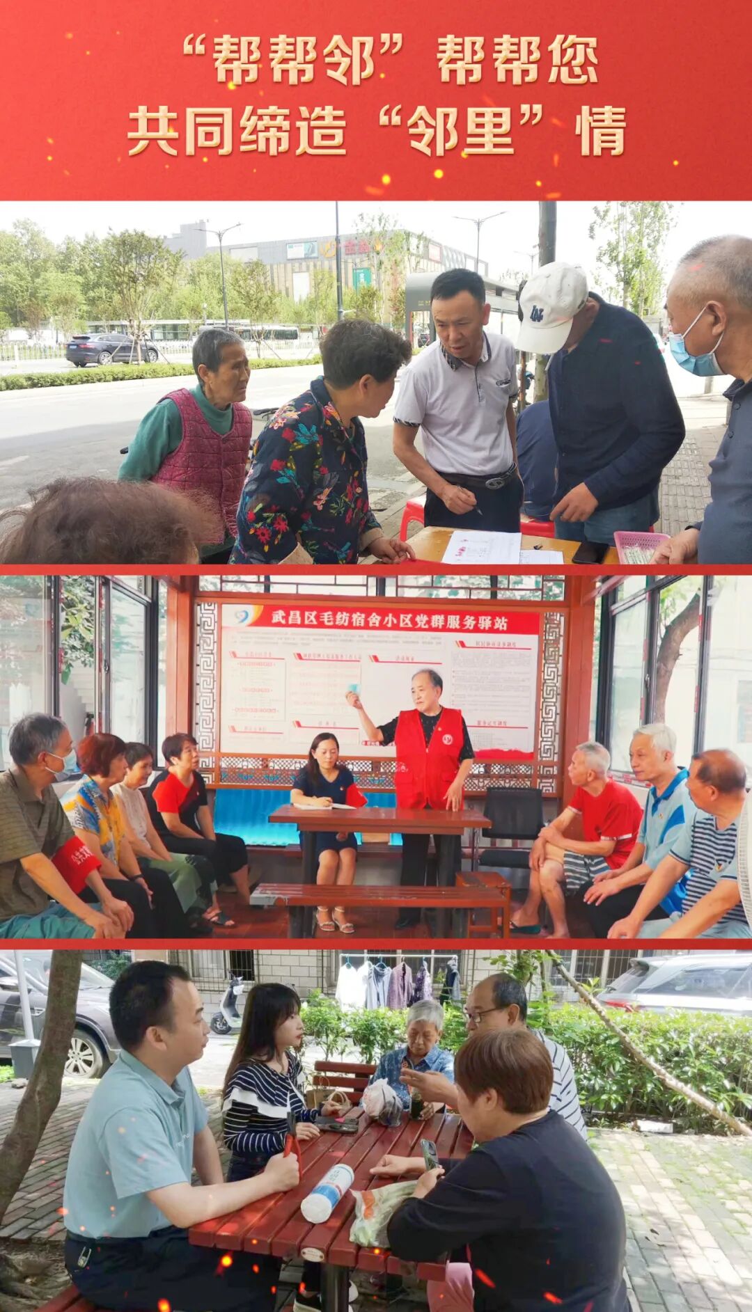 纺器社区坚持党建引领,激发群众自治活力,激活“邻里互助”模式,完善“与邻同行”志愿服务,通过服务善治、平安法治、文化德治、社会共治,打造共建共治共享的和谐家园。