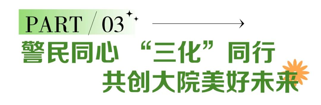 在“三化”行动中,涌现出了很多先进个人——例如带头清扫的老党员、主动出资请专人整理的楼栋长、帮忙清运杂物的干警、下沉党员等。这一幕幕动人的画面,充分展现了警民同心的强大力量,营造了环境综合整治的良好氛围。此次专项行动居民自行清理、集中清理共计废弃杂物10余吨;省公安厅购置绿植2000余株,填补了绿化带空缺部位,美化了大院整体环境;每个楼栋增设规范统一的公示栏81块,更换了31栋住宅楼81个单元公共部位照明灯共计662盏,受到了广大居民的一致好评。