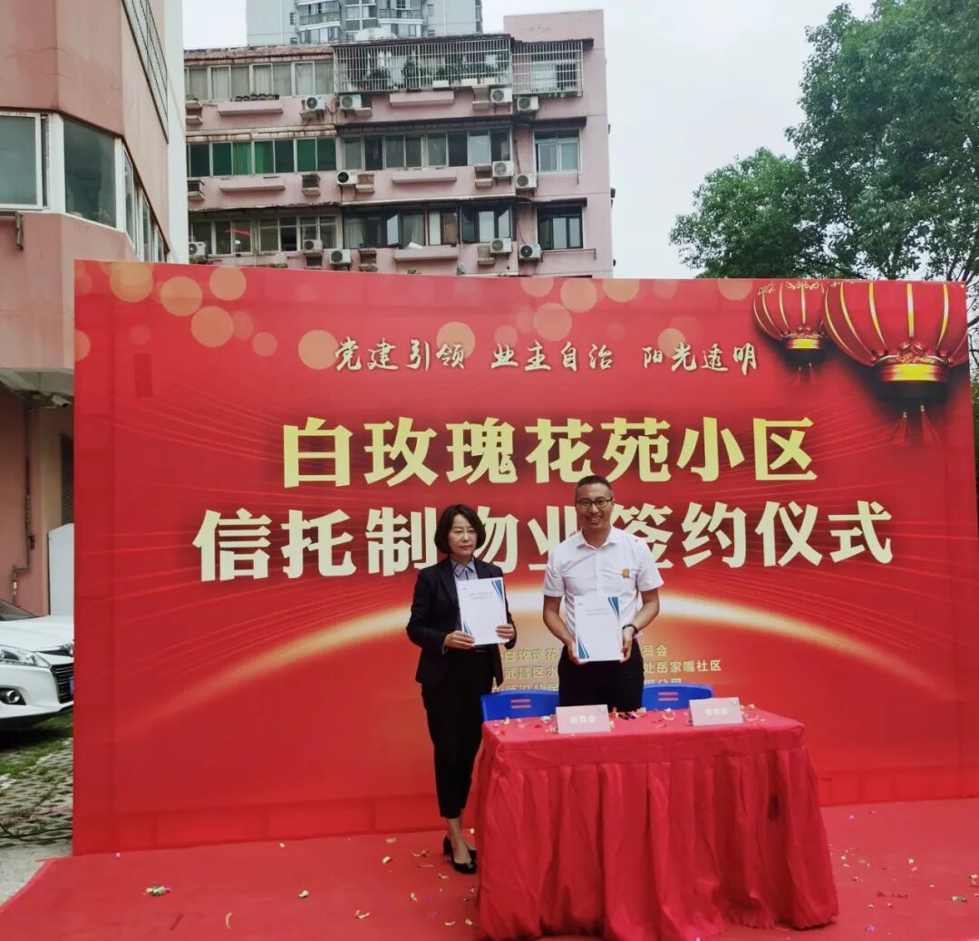 白玫瑰花苑小区建于2000年,是典型老旧小区,路面破损、公共设施破损等问题颇多。2023年7月底,物业公司在合同到期后准备离场。在武昌区委政法委、水果湖街道等单位组织协调下,白玫瑰花苑小区居民自发成立志愿者队伍,挨家挨户上门做工作,宣传“信托制”物业相关知识。最终,经业主大会表决,白玫瑰花苑小区引入“信托制”物业管理服务模式。