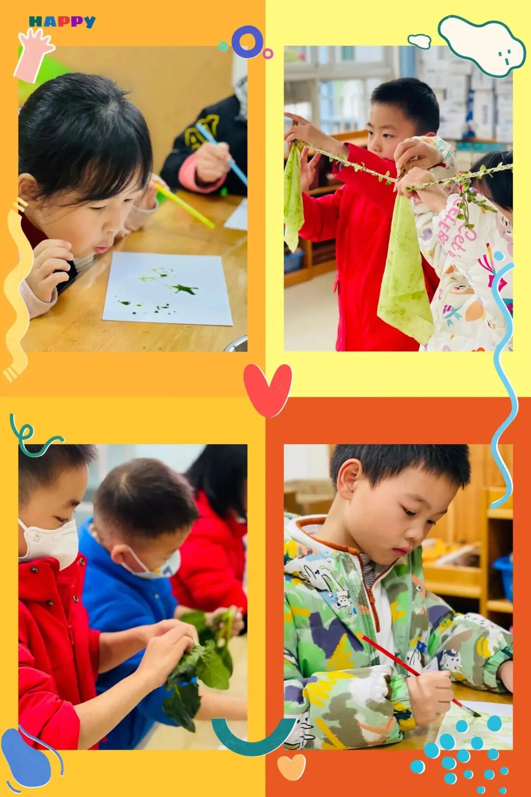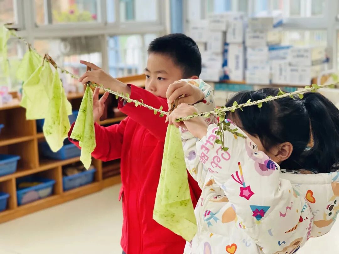 在武昌区四美塘幼儿园有一片由孩子们自己打理的“朴朴菜园”。小朋友们看着菜园里采摘后剩下的老菠菜叶,带着期待又似乎有些遗憾地讨论着,于是师生“头脑风暴”想出利用菠菜汁扎染,留下这美丽的颜色。