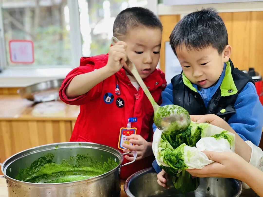 青汁一出,意境到来。孩子们洗、榨、煮、滤,青汁滴答、滴答……一点点的掉落,接下来是浸泡,孩子们挑选着属于自己的布料。他们将布料充分地浸泡在菠菜汁中,等待菠菜汁慢慢地“爬”上布料,为布料换上新衣。