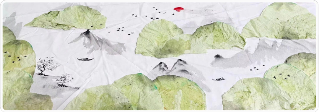 经过时间的沉淀,洁白的布料被染成了豆绿色。接着是晾晒,布料抓揉时形成的自然纹理定格,孩子们开始两两合作动手将布料剪成山脉的形状贴在画卷上,并用水彩颜料为画卷做最后的丰富。“老师,好美啊!就像真正到了山脚。”“老师老师,山水画完成了!”孩子们看着自己用菠菜制作出的山水画兴奋不已。