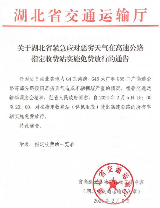 针对近日湖北省境内G4京港澳、G45大广和G55二广高速公路等部分路段因恶劣天气造成车辆拥堵严重的情况,根据交通运输部调度会精神,经省人民政府同意,自2024 年2月5日15: 00至20: 00,对在指定收费站 (详见附表)驶出高速公路的所有车辆实施免费放行。