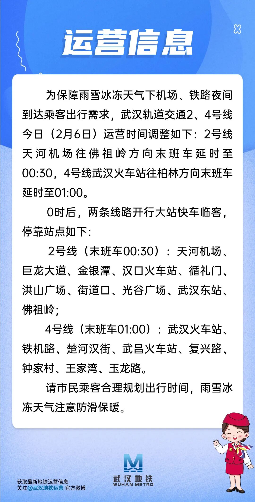 为保障雨雪冰冻天气下机场、铁路夜间到达乘客出行需求,武汉轨道交通2、4号线今日(2月6日)运营时间调整如下:2号线天河机场往佛祖岭方向末班车延时至00:30,4号线武汉火车站往柏林方向末班车延时至01:00。0时后,两条线路开行大站快车临客,停靠站点如下:2号线(末班车00:30):天河机场、巨龙大道、金银潭、汉口火车站、循礼门、洪山广场、街道口、光谷广场、武汉东站、佛祖岭;4号线(末班车01:00):武汉火车站、铁机路、楚河汉街、武昌火车站、复兴路、钟家村、王家湾、玉龙路。
