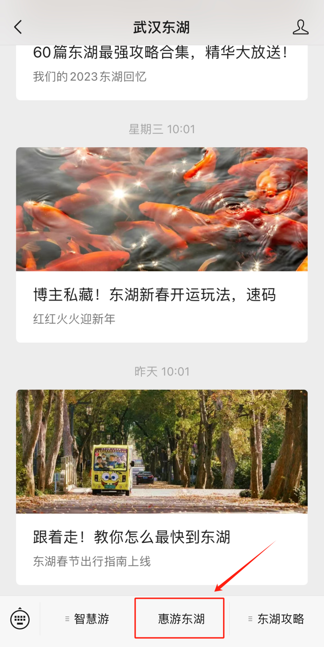 关注「武汉东湖」官方微信公众号(账号:easylake),进入公众号主页,点击下方菜单栏【惠游东湖】进行预约。