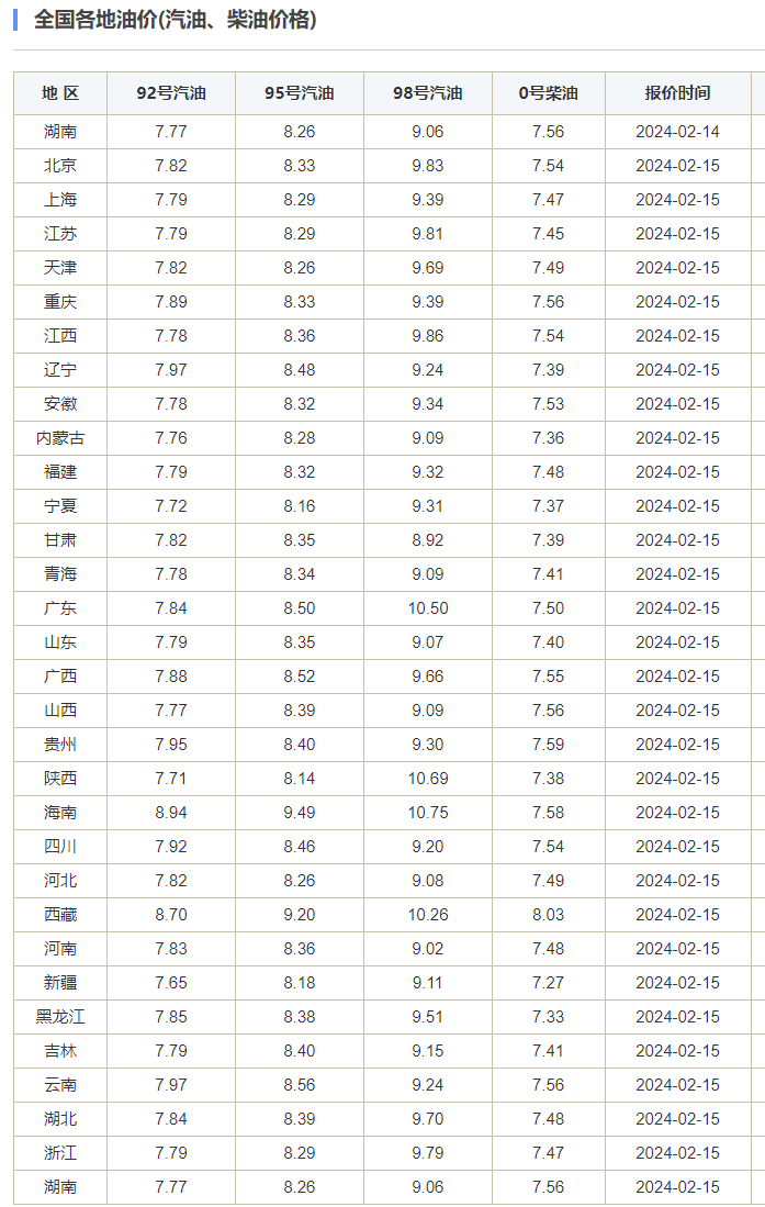 就当前油价来看,国内各省市加油站油价执行2月1日0时以来水平。92#汽油平均报价约为7.9元/升,各省市价格范围为7.65~8.94元/升;95#汽油平均报价约为8.4元/升,各省市价格范围为8.14~9.49元/升。