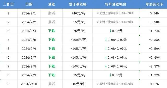 本轮油价到今天2月18日已经进行了9个工作日的统计,受到春节假期国际油价大涨影响,今天的跌幅比上个工作日减少了80元/吨,目前原油变化率:-0.09%,预计下调油价5元/吨,跌幅已经小于50元/吨的最小下调标准,回到搁浅调整的范围。现在距离油价调整不到48小时,油价恐无缘下跌。