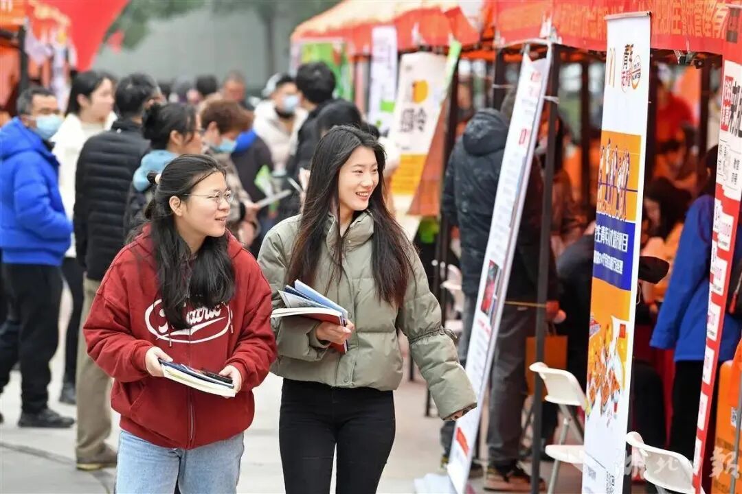 招聘会现场热闹非凡,求职者络绎不绝,招聘摊位前人头攒动,参会企业的招聘负责人们热情的向求职者介绍招聘岗位和工作内容。