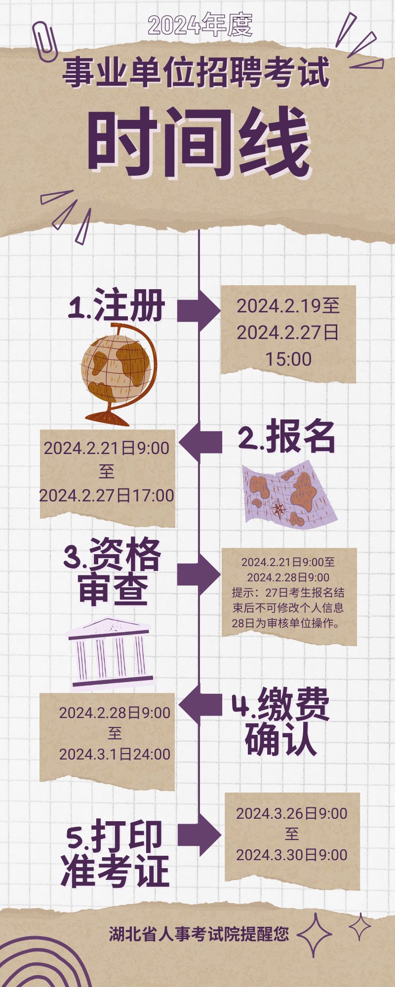 1.注册:2024年2月19日至2月27日15:00,报考人员注册,接受个人基本信息认证。2月27日15:00,注册窗口准时关闭。在2023年全省事业单位统一公开招聘中已成功注册为湖北省人事考试网用户的人员,无需重新注册,但可以更新相关信息。