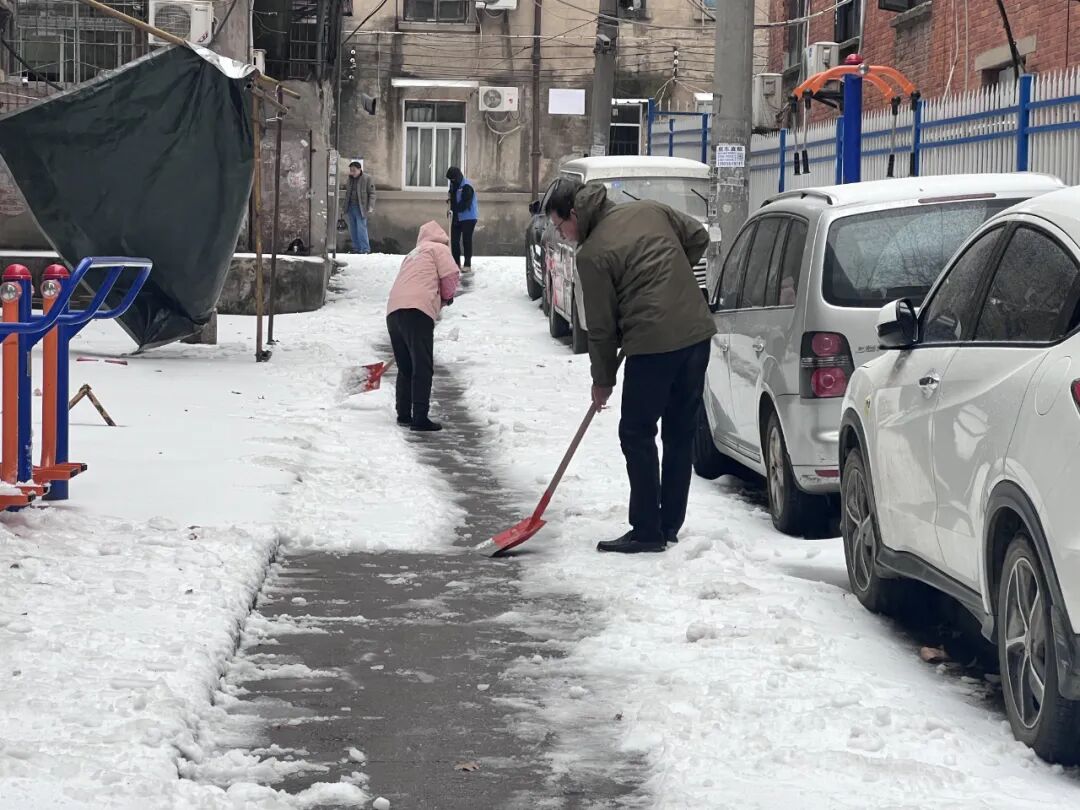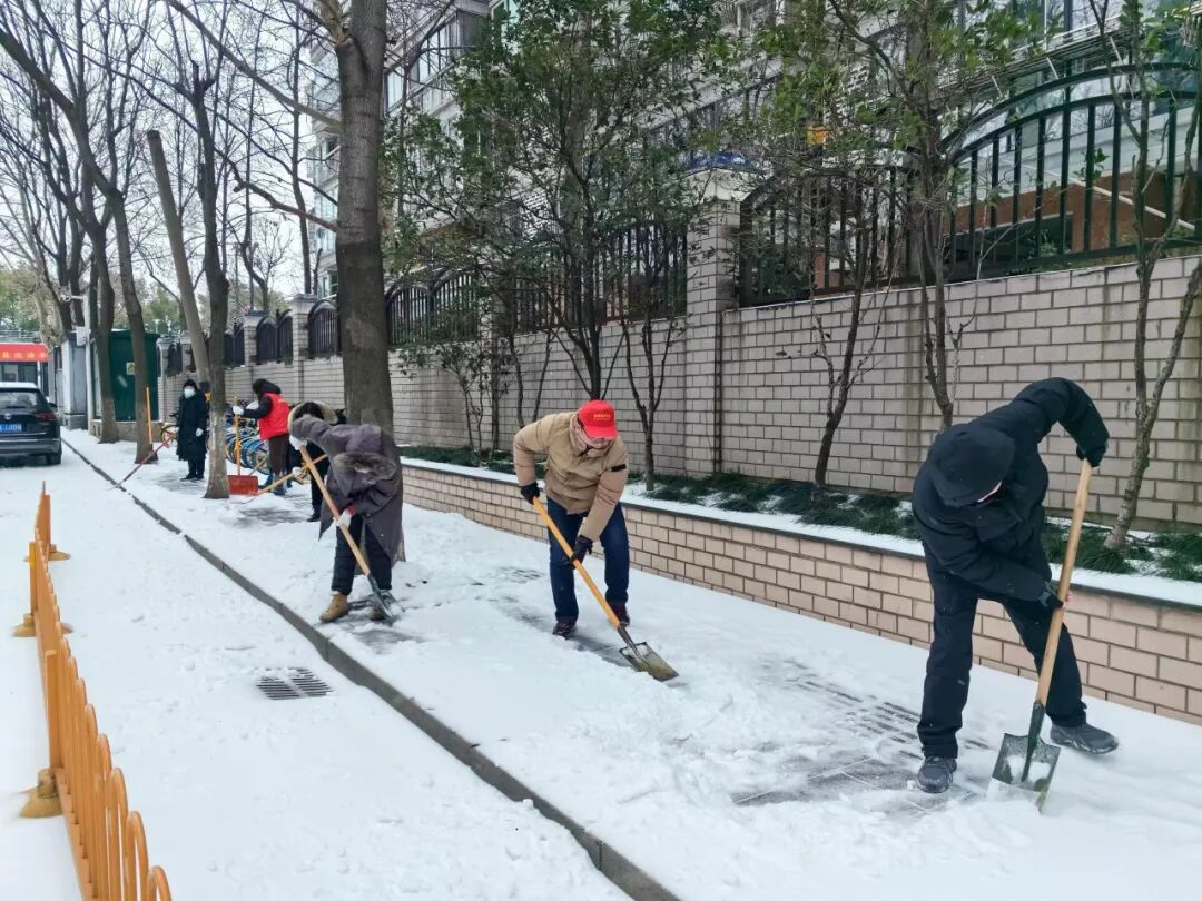 积玉桥街道金都蓝湾社区工作人员、区大数据中心下沉党员和志愿者,清理人行道和小区出入口的积雪,为居民出行提供便利。