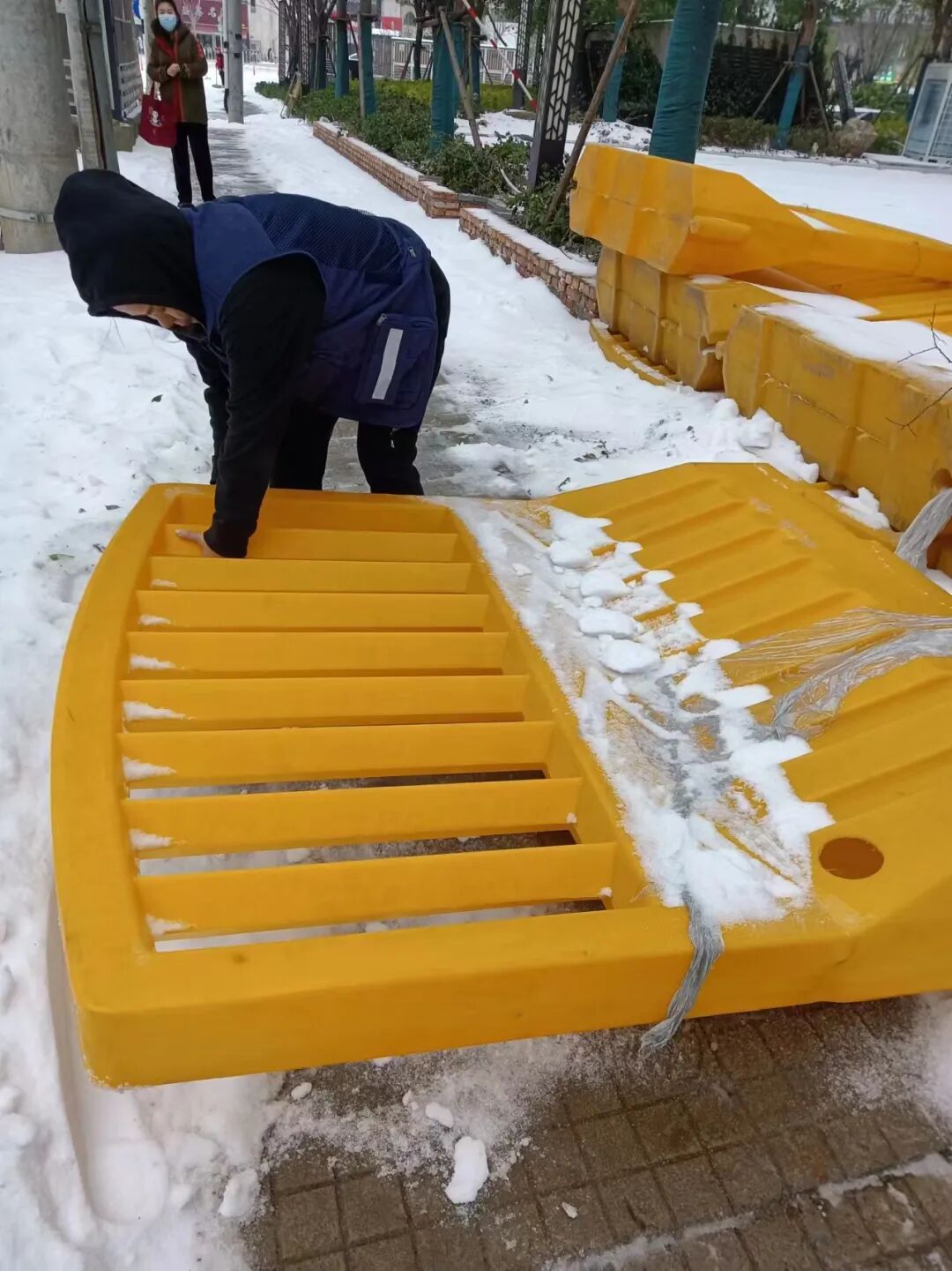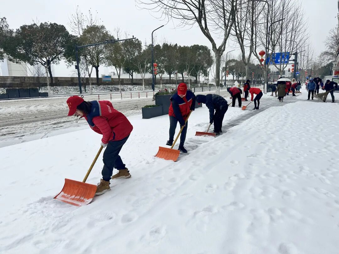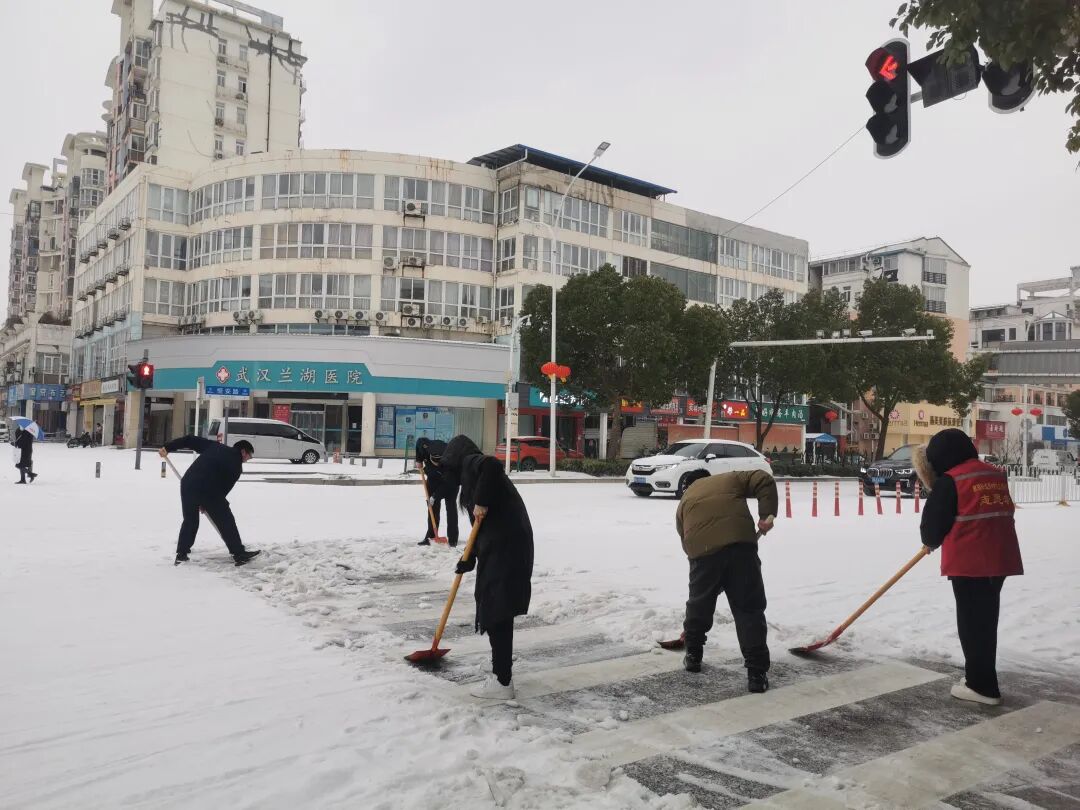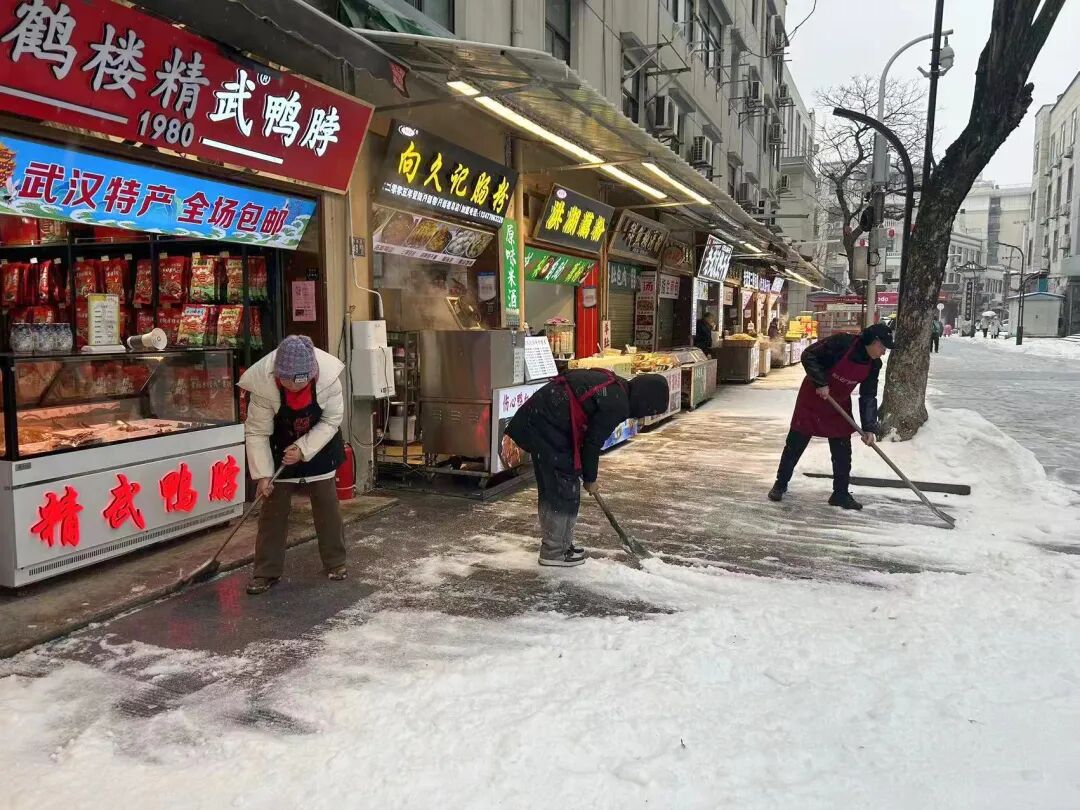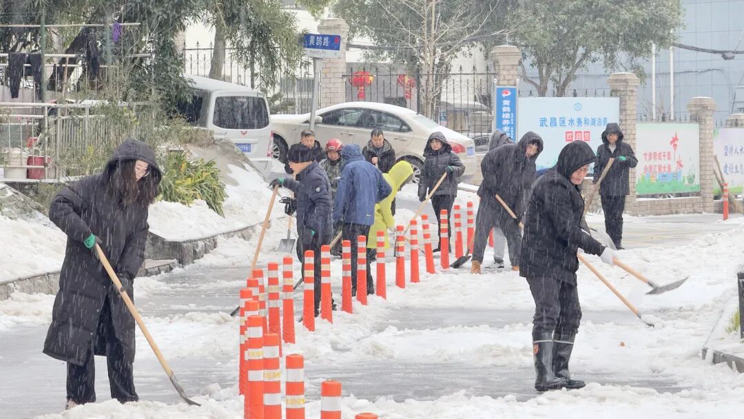 武昌区水务和湖泊局党员同志参与黄鹤楼街道彭路社区除雪工作,清扫沿线积雪。