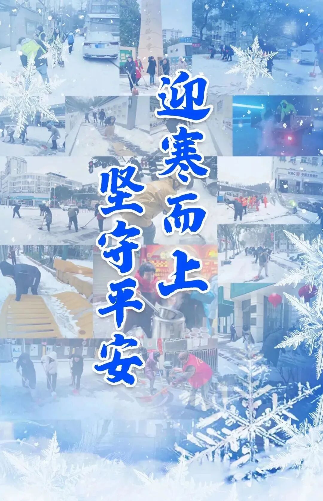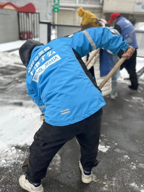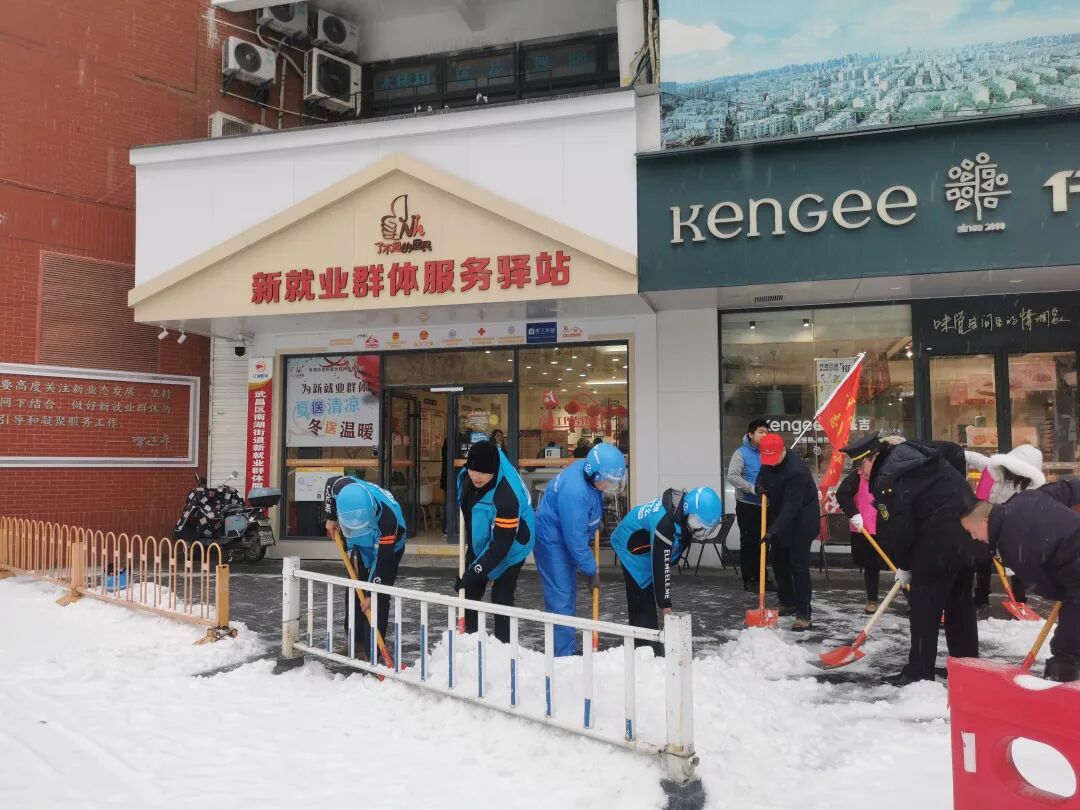 南湖街道新就业群体服务驿站,外卖小哥与志愿者清除积雪,街道居民自发到恒安路参与铲雪行动。