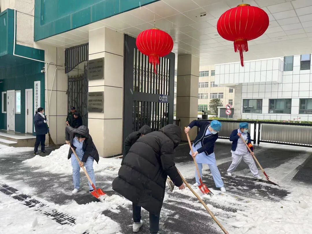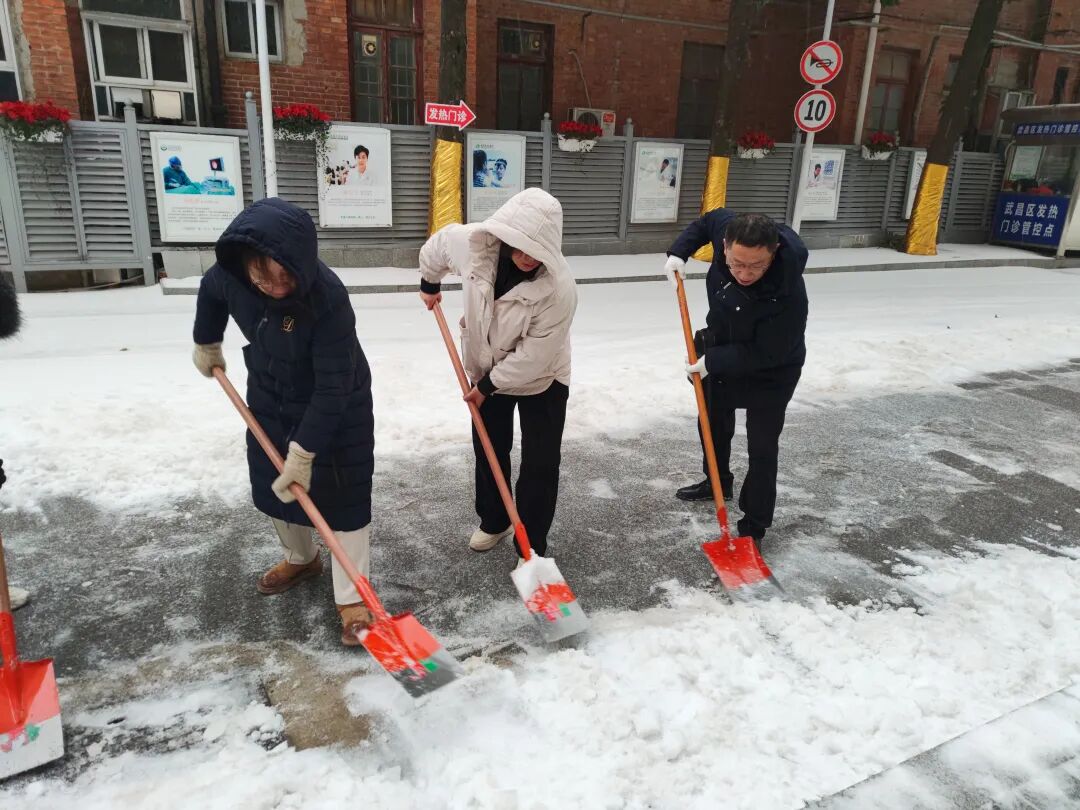 武汉市武昌医院各院区医护人员参与铲除铁四院路、杨园街主干道积雪,保障患者就医安全。