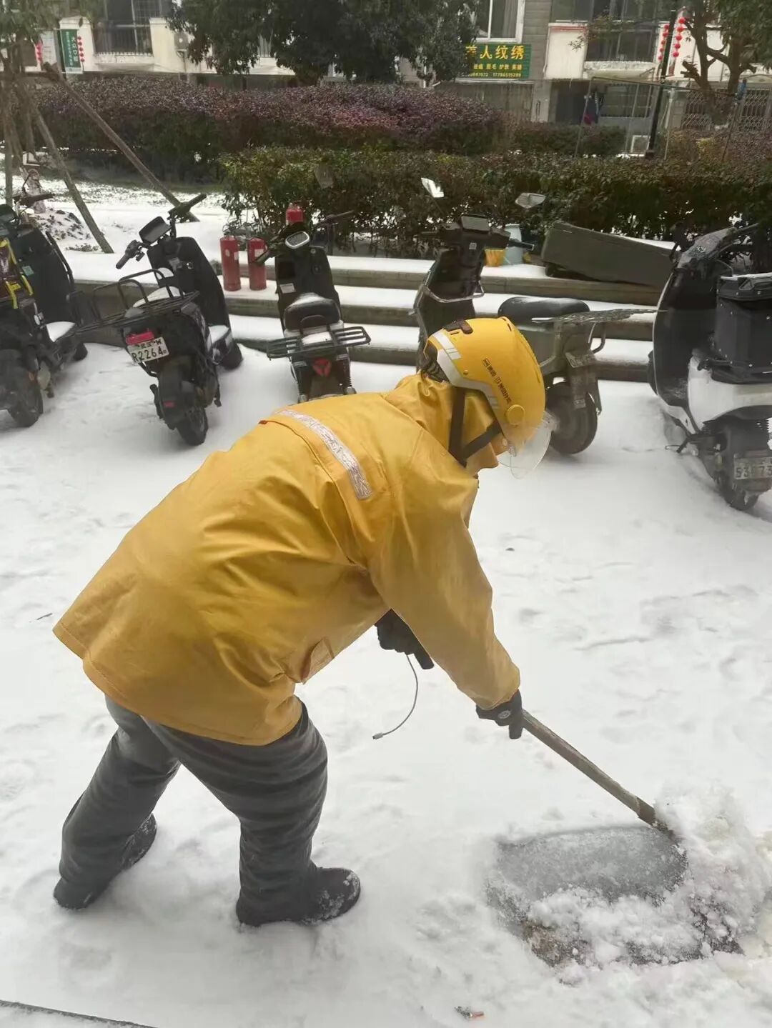 白沙洲街道佳韵社区美团骑手主动铲除路面冰雪,下沉党员、驻社区律师共同铲除涂家沟社区入口道路的积雪。