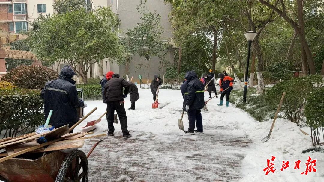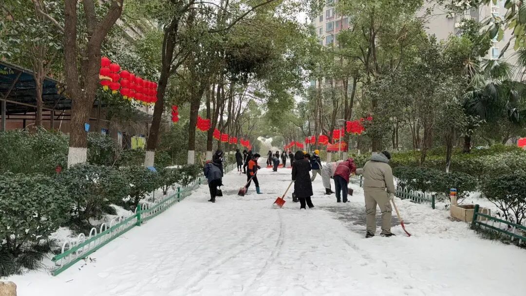 ▲小区物业工作人员一大早就集中力量在主干道铲冰除雪,保障居民出行