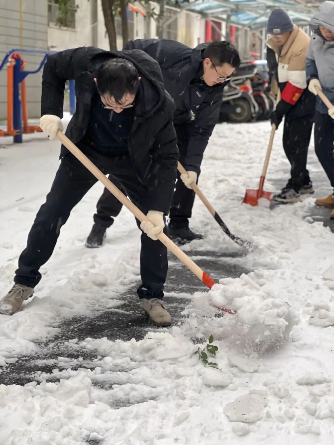 碳排放权登记结算(武汉)有限责任公司下沉党员突击队到水果湖街道机安社区开展中北路知音广场沿线铲冰扫雪,完成近千米人行道路的清雪工作。