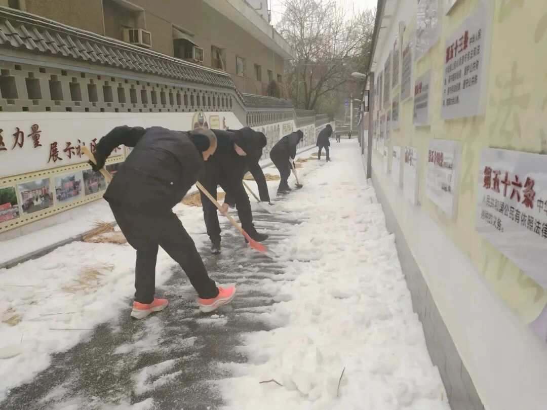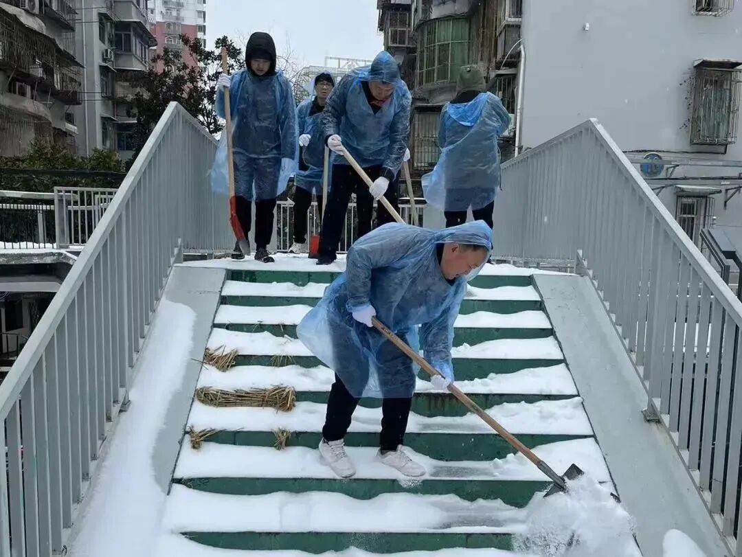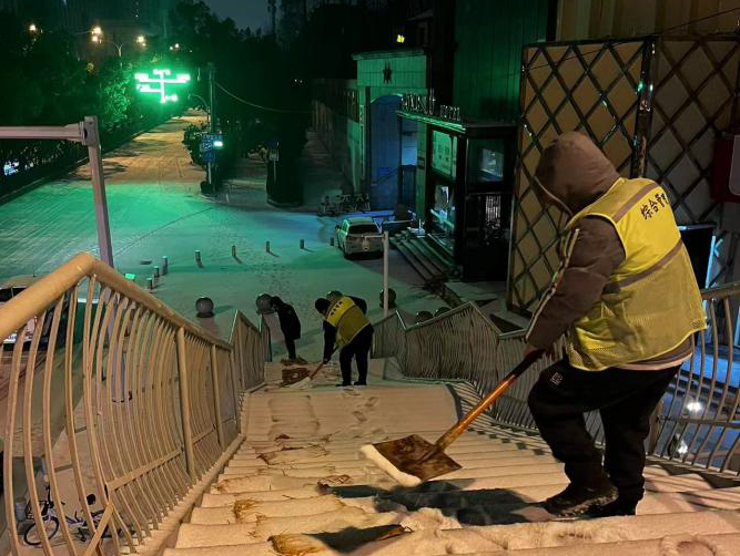 珞珈山街城管组织应急队进行24小时值守巡查,在八一路天桥、东湖村社区等易积雪路段撒布融雪剂、铲雪铺草垫,采取“边下边清、人工+机械相结合”的方式不间断循环作业,确保居民出行通畅,在严寒中筑起“温暖防线”。