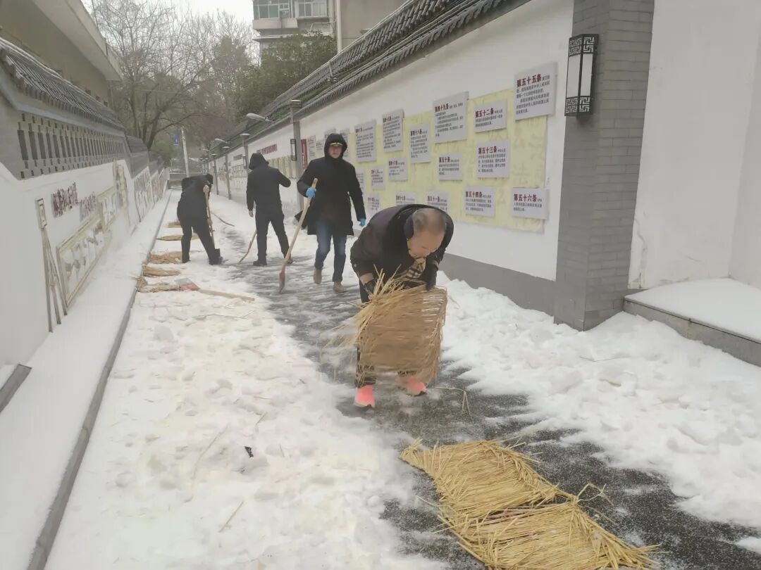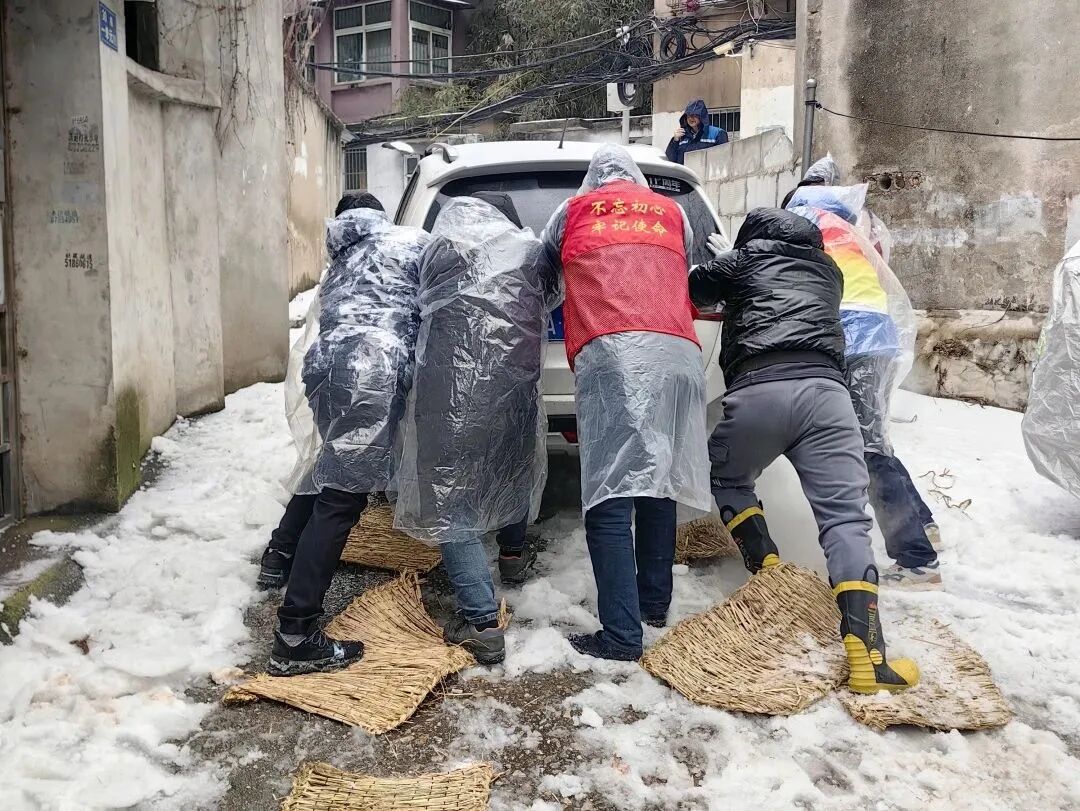 区人大办协助水果湖街道东湖路社区清除积雪,铺设草垫。