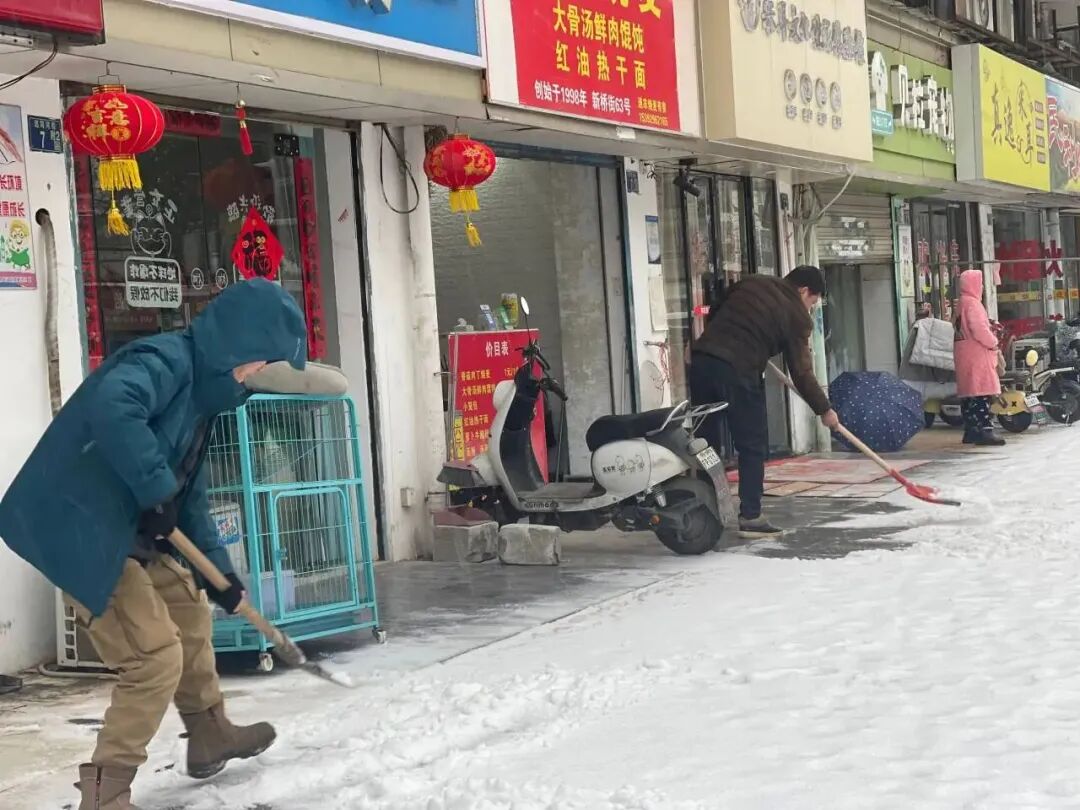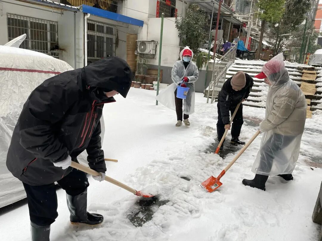 首义路街道长湖社区,民盟湖北省委机关干部与街道、社区工作人员一起铲冰除雪,并对重要通行路段进行撒盐融雪,保障重要路段的居民、商户出行安全。