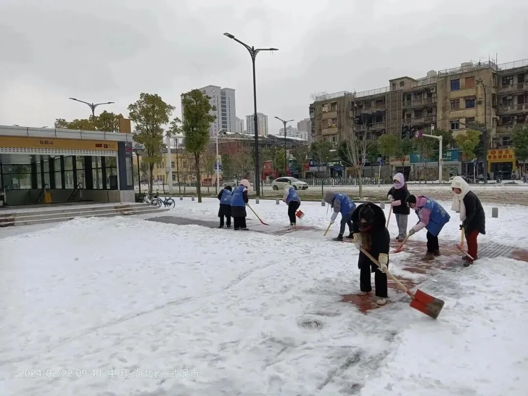 徐家棚街道武车社区、绿地楚峰物业,对三角路地铁E出口周边道路扫雪除冰。