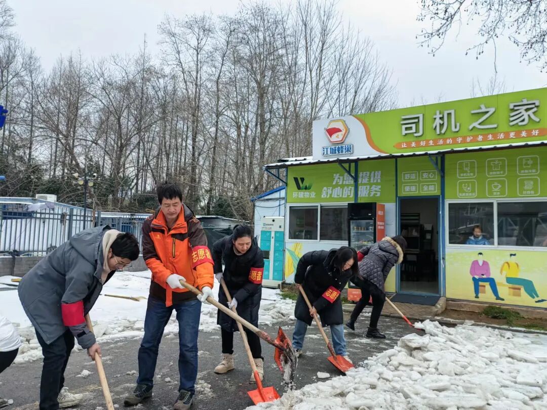 紫阳街道出动铲车对小区主干道进行机械化除冰,辖区津水路司机之家联合武昌环建物业资产经营有限责任公司发挥户外工作者驿站阵地功能,为新就业群体提供热水、充电等便民服务。