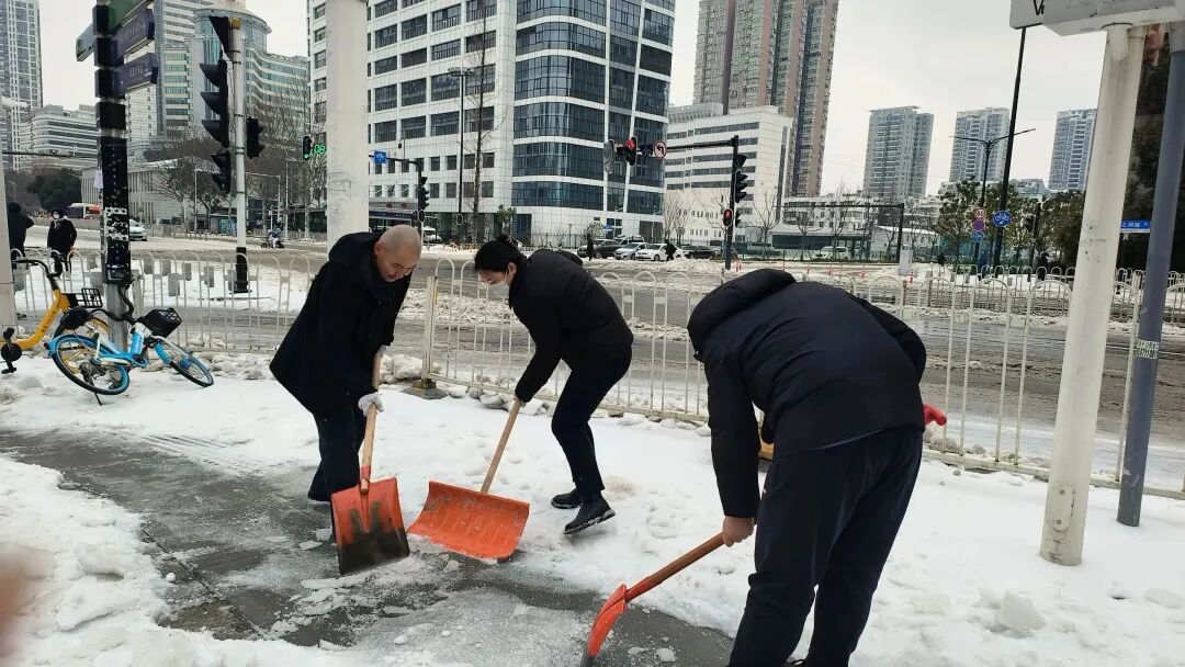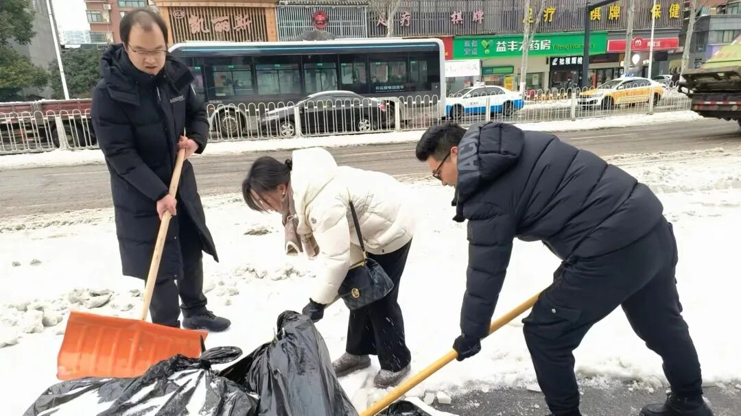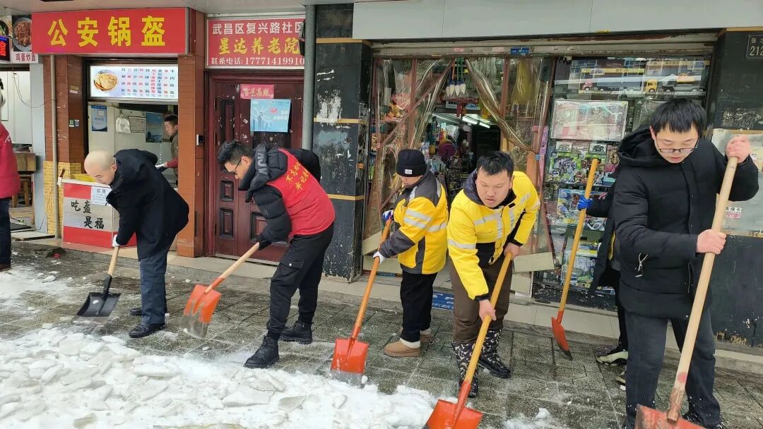区总工会组织由劳模、工匠、律师团队、新就业群体、干部职工组成的武昌工友志愿服务队50余人,下沉紫阳街道复兴路社区扫雪除冰。