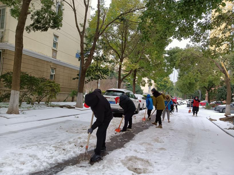 武昌社保处下沉党员在紫阳街保望堤社区铲雪除冰。