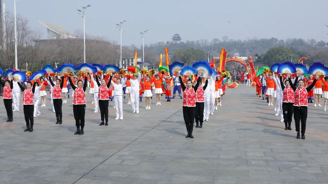 紫阳湖街歌笛湖时尚锣鼓艺术团、中南路街晒湖社区龙凤腰鼓队敲响了新年祝福的锣鼓声;石洞街白云之声艺术团、白沙洲街长江紫都社区群艺百岁剧团随着激昂的节奏舞出内心的热情;南湖街文学艺术界联合会带来的民俗表演精彩开演,现场气氛再度升温;武昌区武术协会表演的太极功夫扇是在太极拳基础上进行创编,柔中有刚,轻盈圆活,飘逸潇洒,自然高雅。表演者精神抖擞,动作整齐划一,扇面时开时合,动作优美造型大方,一招一式融入了千年的中华文明,举手投足焕发着自强不息的民族精神。