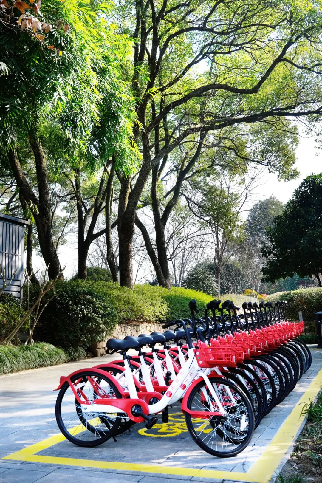 东湖绿道湖中道全线可租借自营共享单车「小红羚」及其他品牌共享单车、共享电动车,骑行前往樱花园附近,全程畅通,游玩绿道、赏花两不误。(停车时需注意停放到指定区域哦)