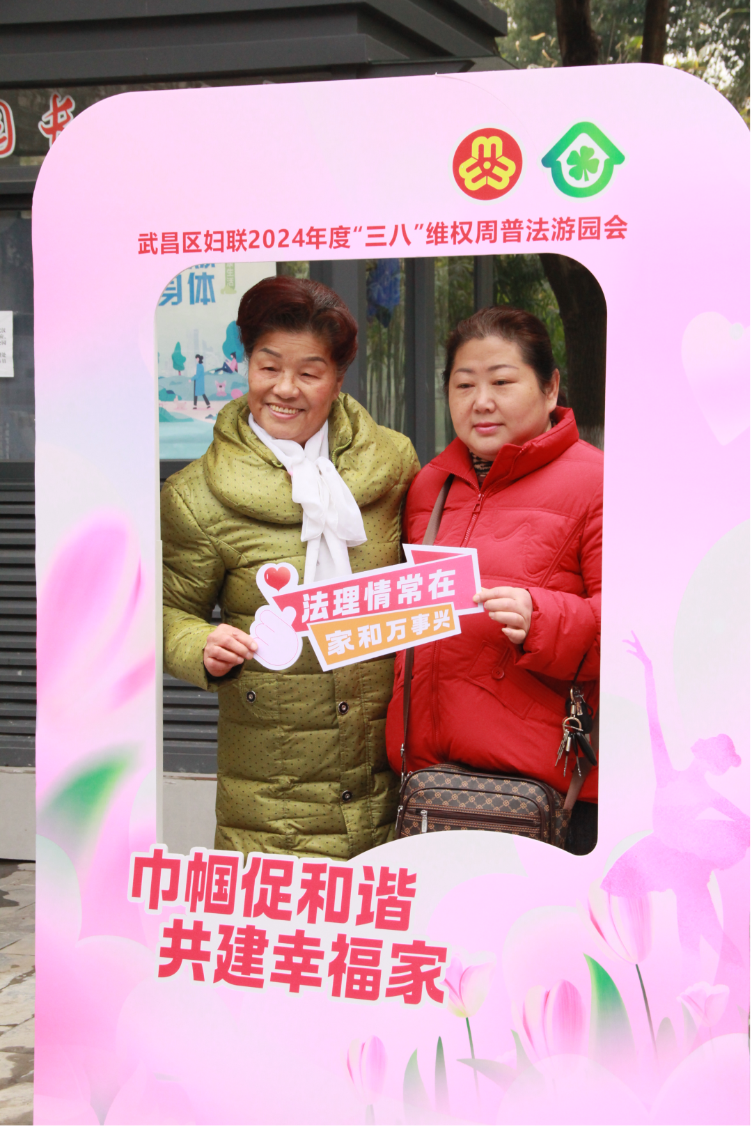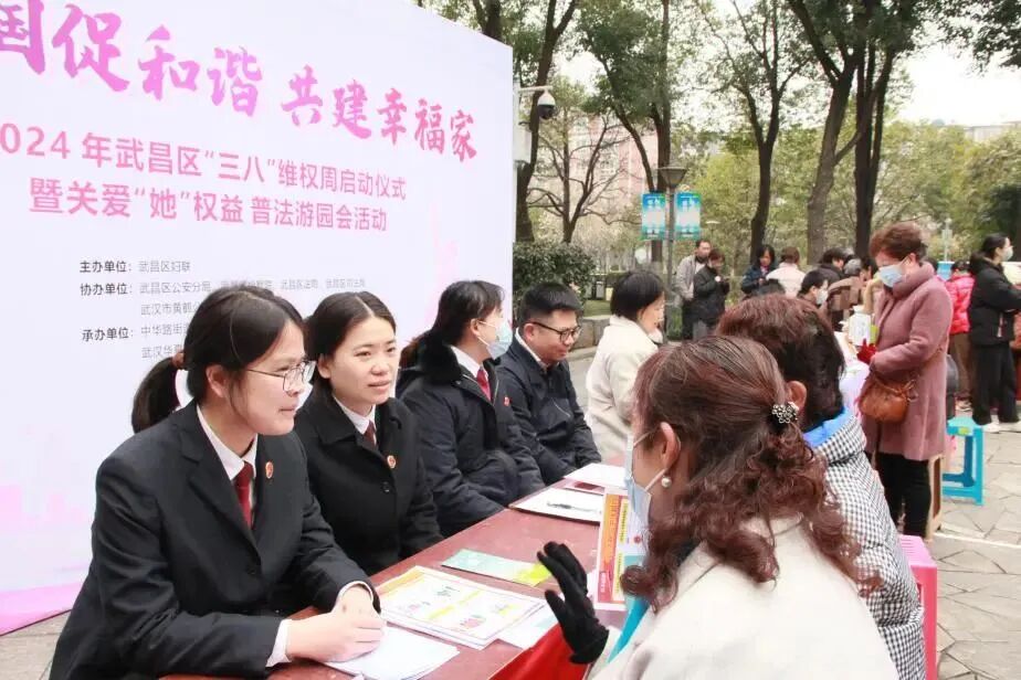 当天上午,区妇联还在武昌廉政文化公园举办了“巾帼促和谐 共建幸福家”2024年武昌区“三八”维权周启动仪式暨关爱“她”权益普法游园活动,邀请区公安分局、区检察院、区法院、区司法局、武汉市黄鹤公证处、中华路街道等单位开展法治宣传、维权服务、婚恋指导、心理咨询、婚姻调解、志愿服务、公证等“一站式”服务。活动共发放宣传册千余份,宣传品600余件,接待法律咨询200余人次,为助力推进平安家庭、平安武昌建设营造了浓厚的法治氛围。