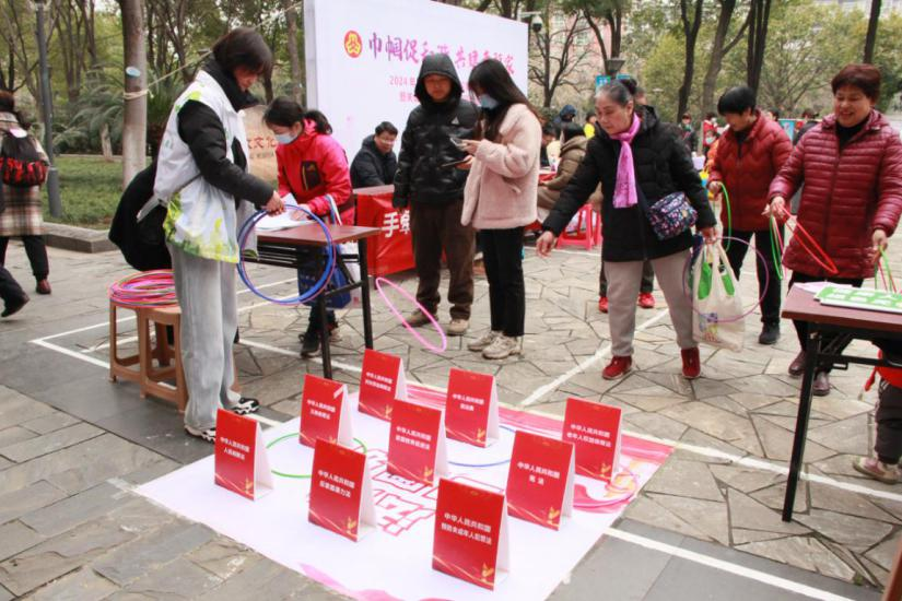 活动现场,关爱“她”权益普法游园活动也在同步进行,为广大妇女群众送上了沉浸式、互动式的法治“大餐”。“法治大转盘”、一“法”即中、法治拼拼乐、法治圈圈乐和法治连连看等法治游戏吸引了众多市民的踊跃参与。