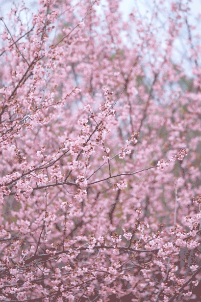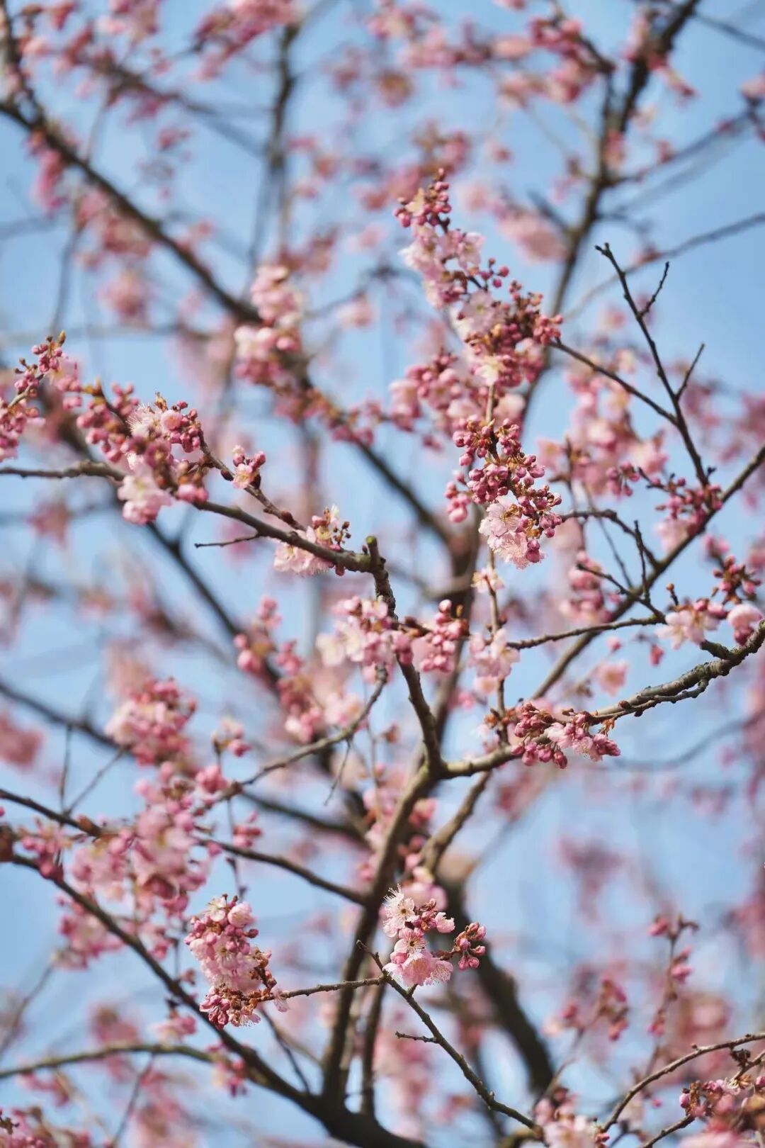 刚走近文理学部第五教学楼一树粉红探出墙来十余棵「椿寒樱」已绽放6-7成树下人流如织校医院旁的玫红色「云南早樱」目测也开放了6成