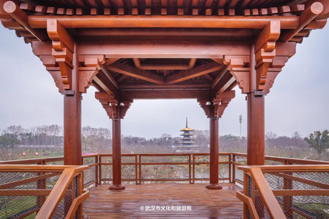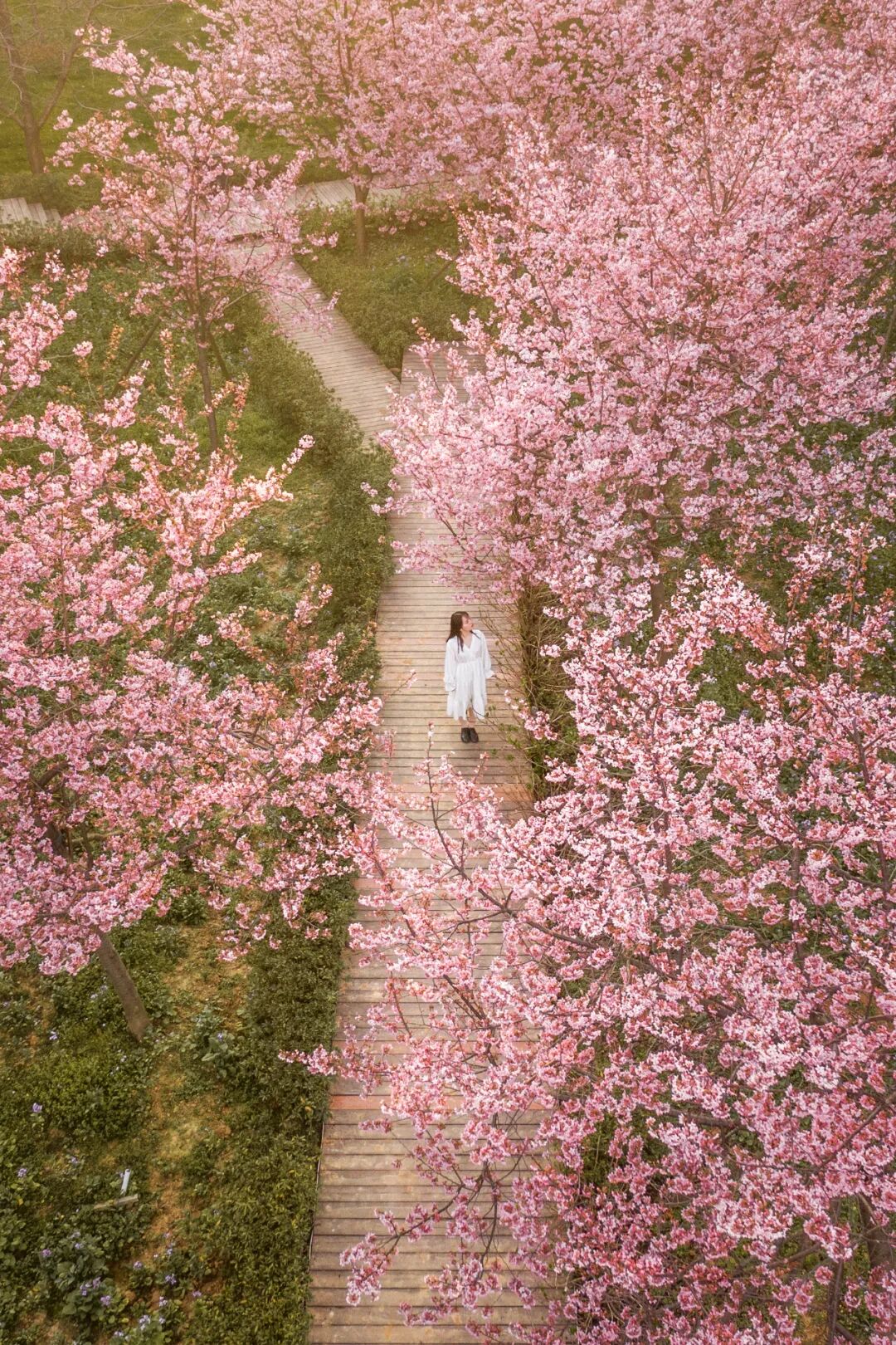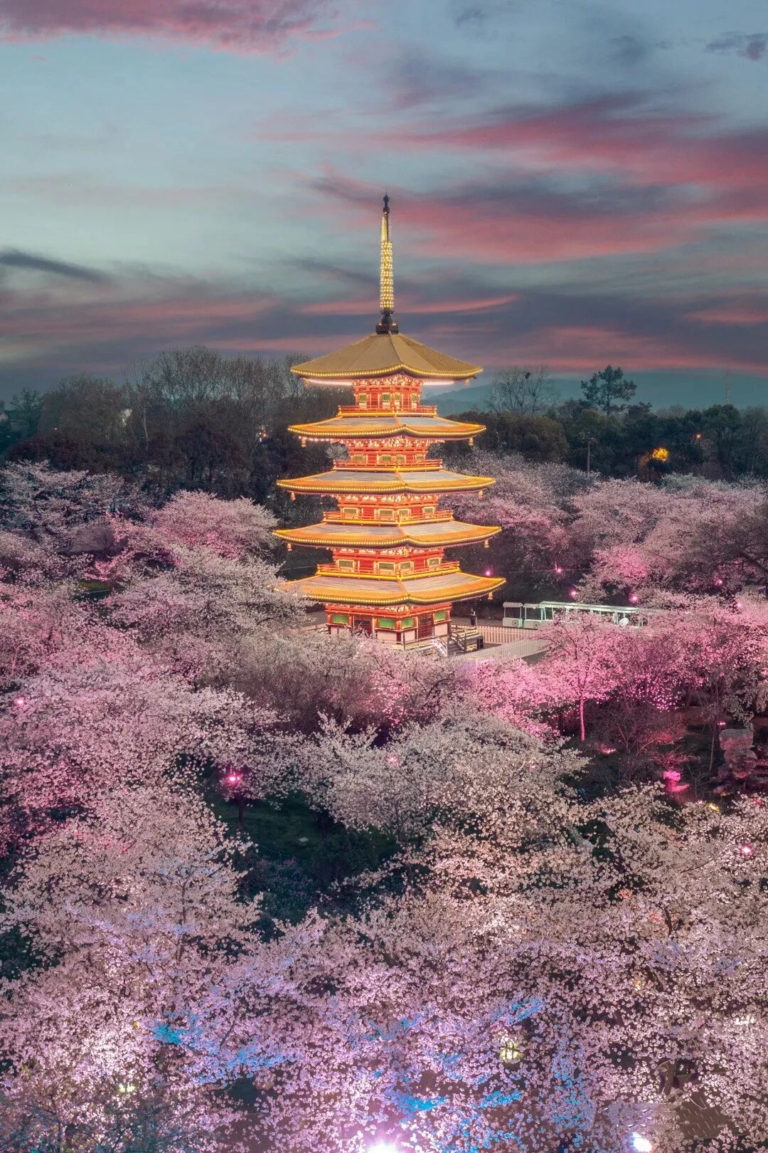 值得一提的是今年,樱园景观升级打造了143米长的赏樱空中栈道可以俯瞰满园花海也是夜晚看五重塔灯光秀的绝好机位