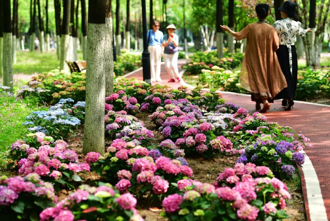 菊花桃、八仙花、樱花、月见草打造高颜值花漾园路;