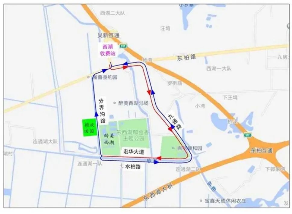 需前往郁金香主题公园的车辆,可按东柏路或油纱路——九通路——郁金香主题公园路线通行;需前往撒欢田园的车辆,可按东柏路或油纱路——九通路——宏华大道——撒欢田园路线通行。