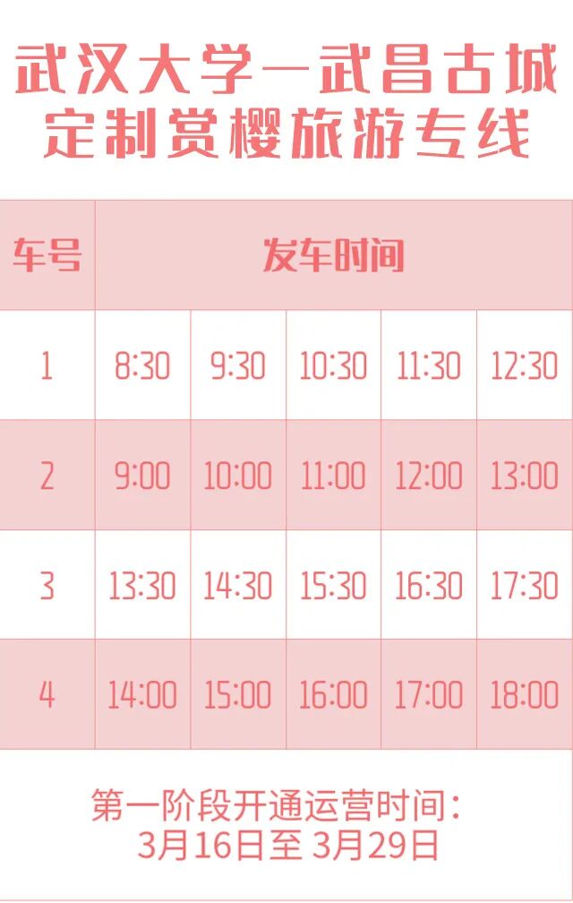 到武汉大学赏樱花,是每个外地游客心心念念的事情。3月16日起,武昌古城定制赏樱旅游专线,8:30出发,已成功预约入校赏樱的游客,可乘坐专列直达武汉大学,不用走弯路,还有专线讲解员,让你的旅途更愉快。