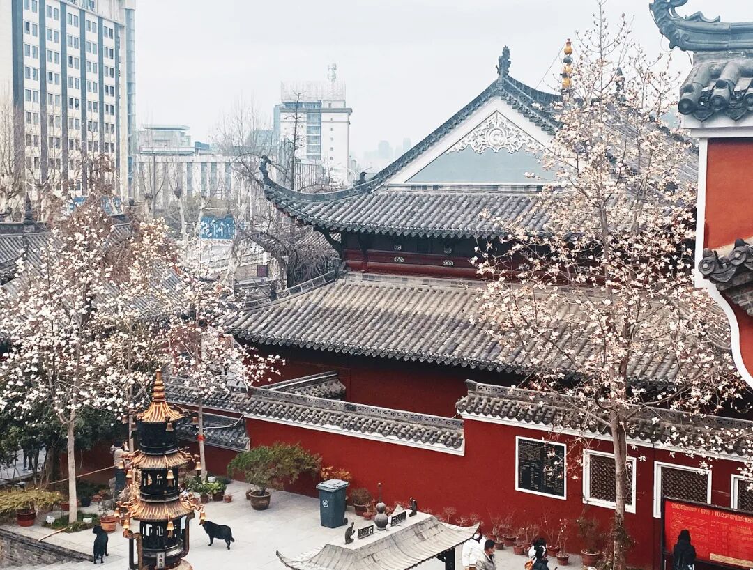武商梦时代对面的宝通寺也是一大打卡点。它是武汉现存最古老的寺院,有1600多年的历史,现在还能看到建筑明显有皇家气派,非常适合穿汉服拍照,很有“故宫同款”意境。